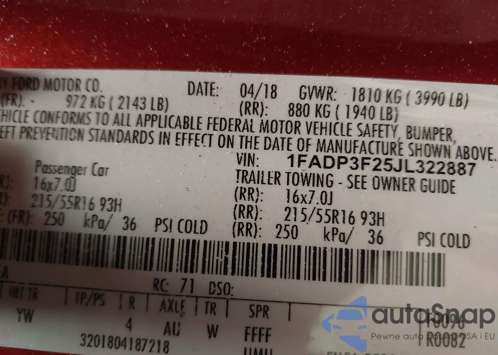 • VIN 1FADP3F25JL322887