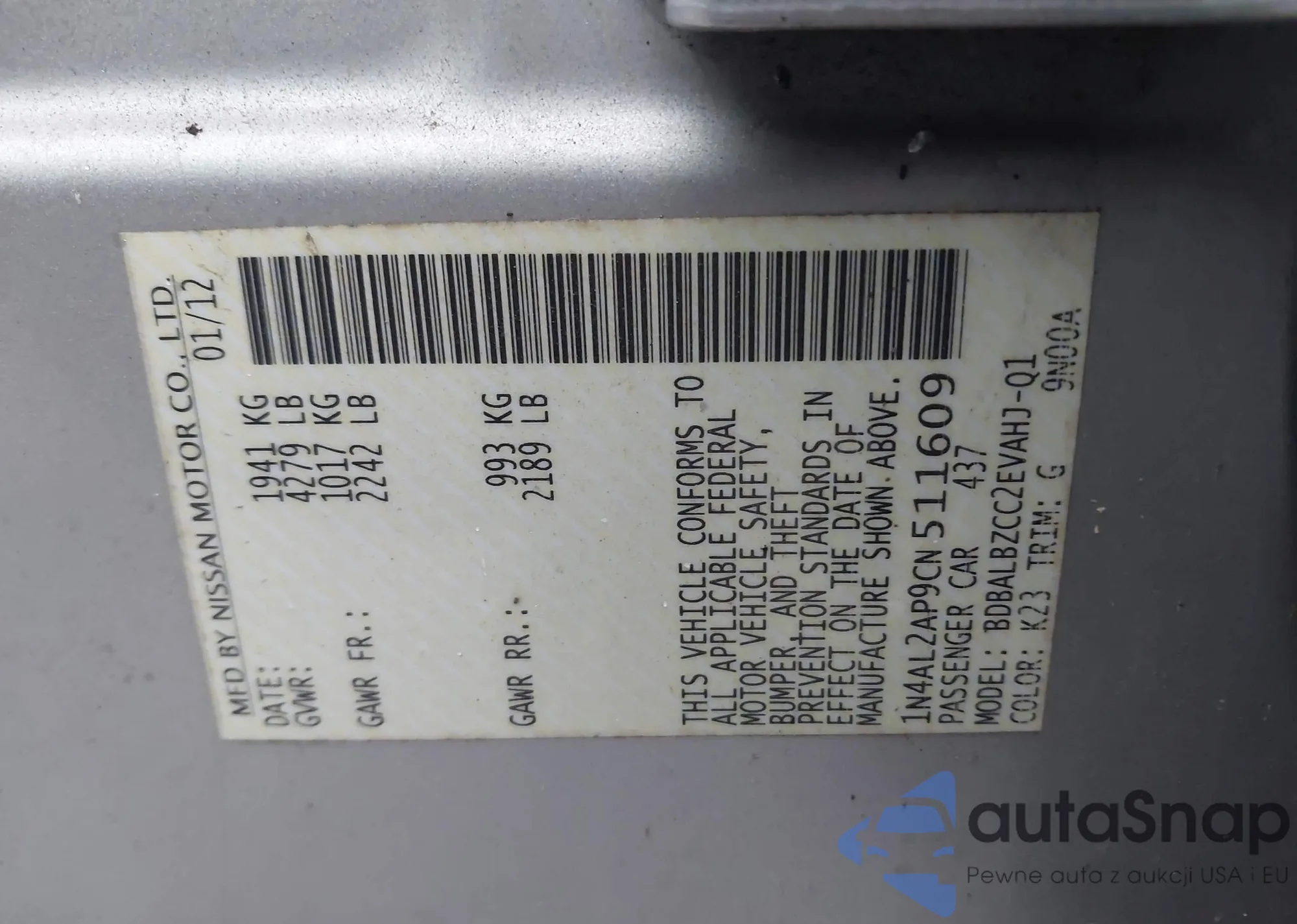 LOT: 43594590 VIN: 1N4AL2AP9CN511609