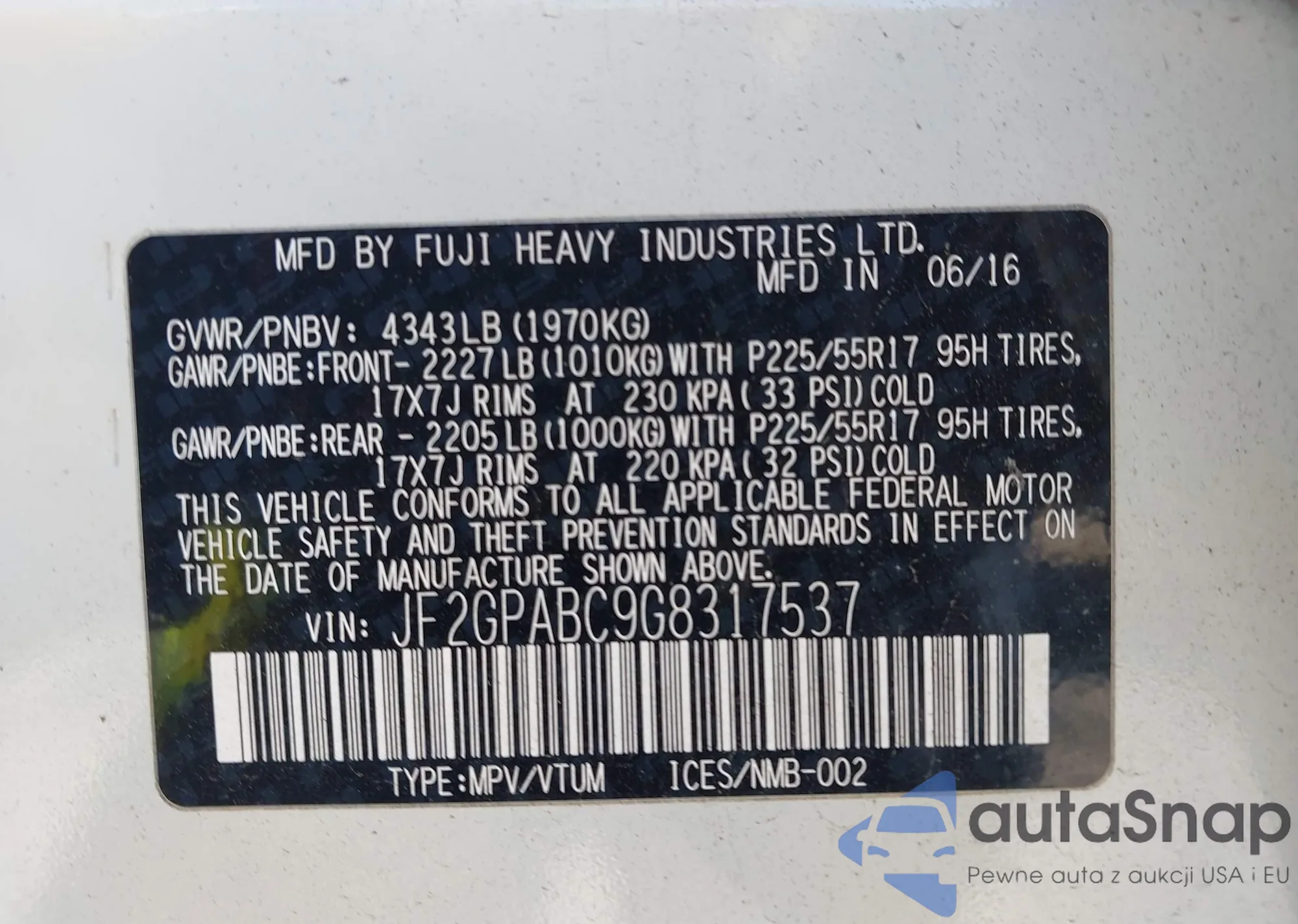LOT: 43736264 VIN: JF2GPAMC9F8321051