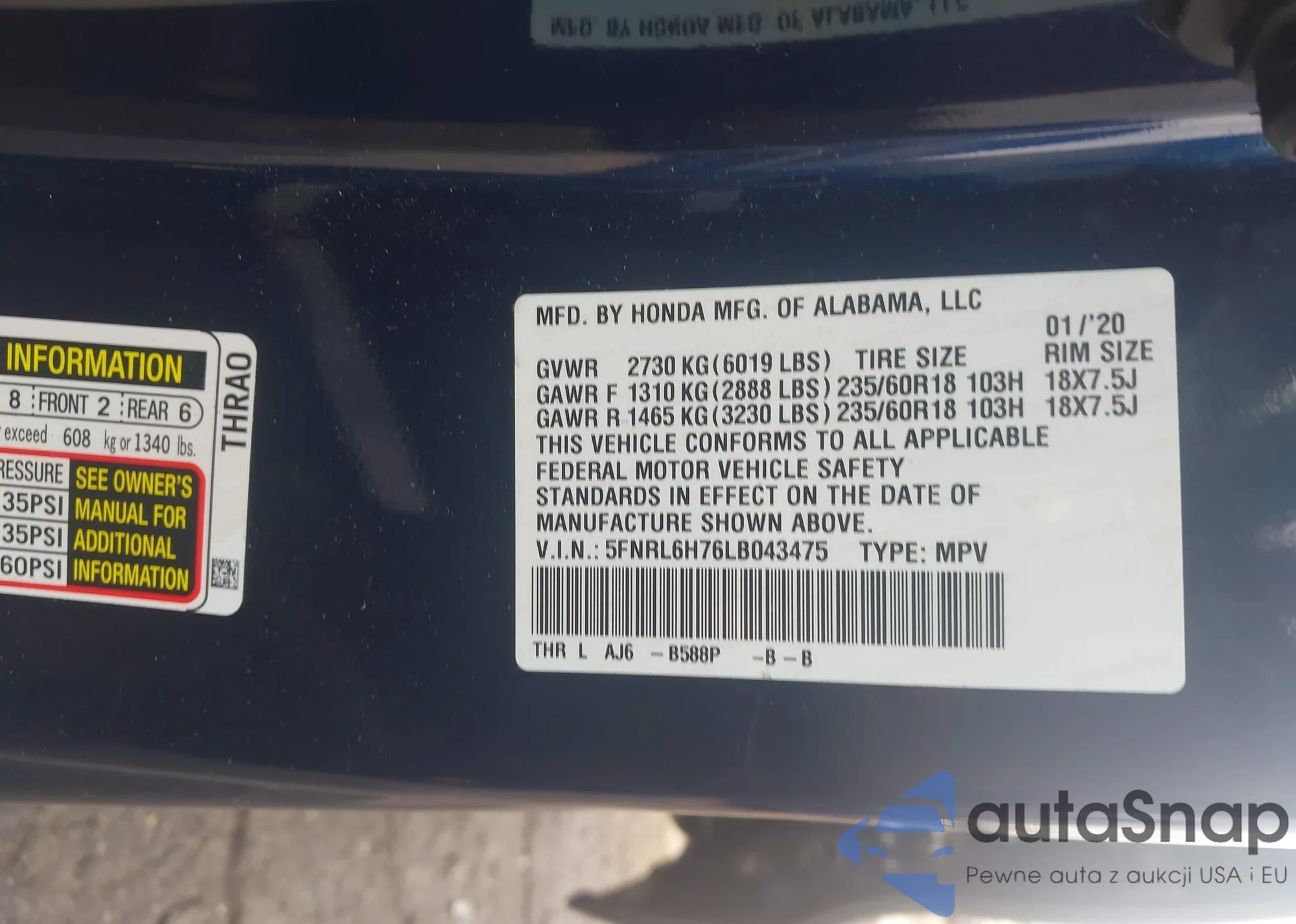 • VIN 5FNRL6H76LB043475