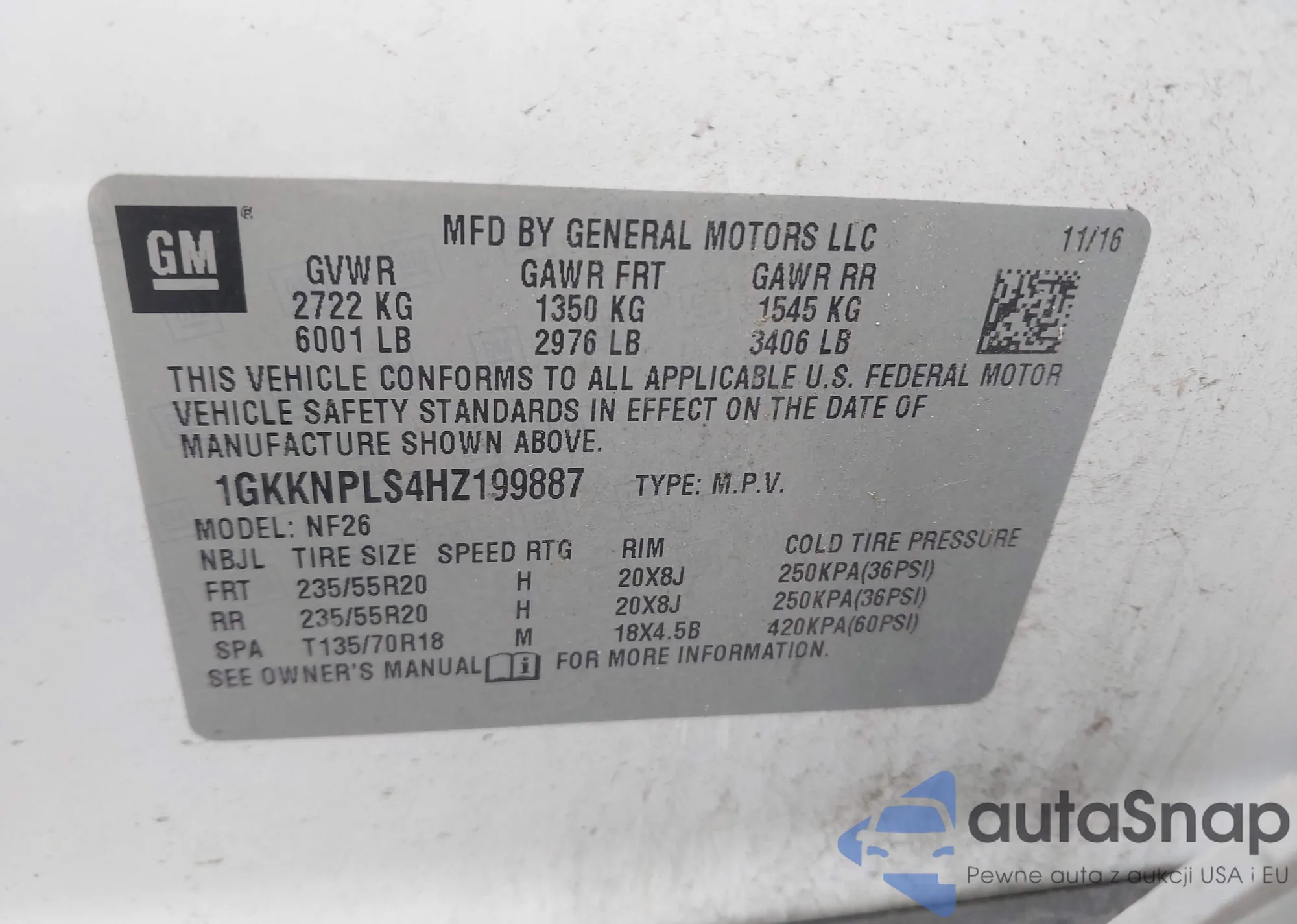 LOT: 43688519 VIN: 1GKKNPLS4HZ199887