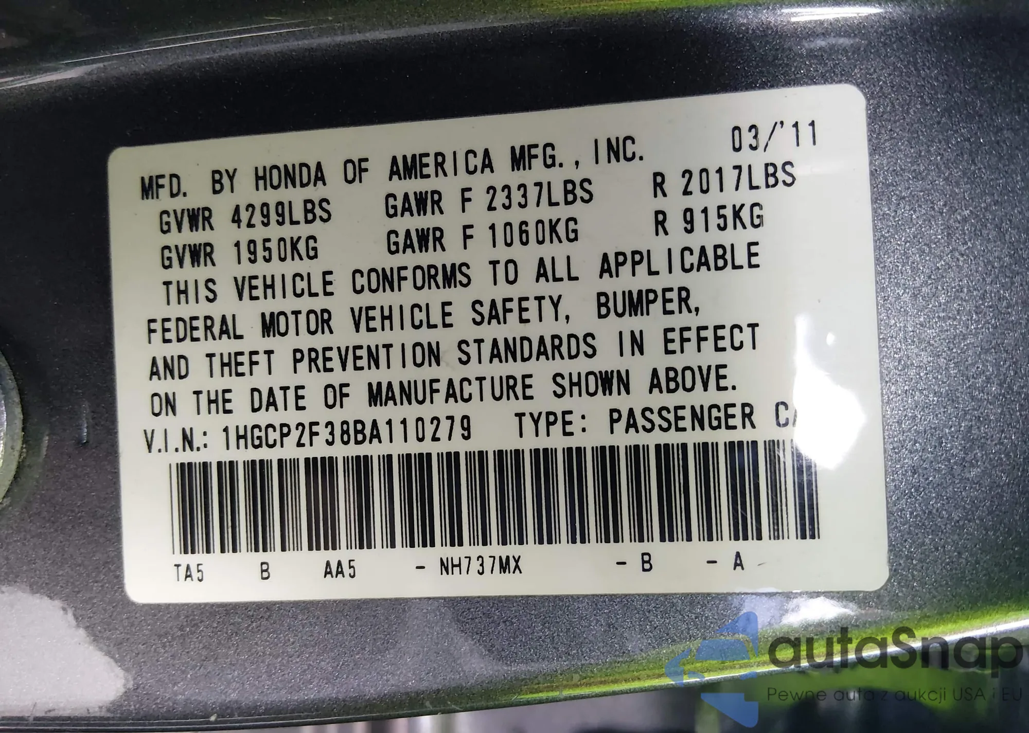 • VIN 5FNYF4H94FB036943