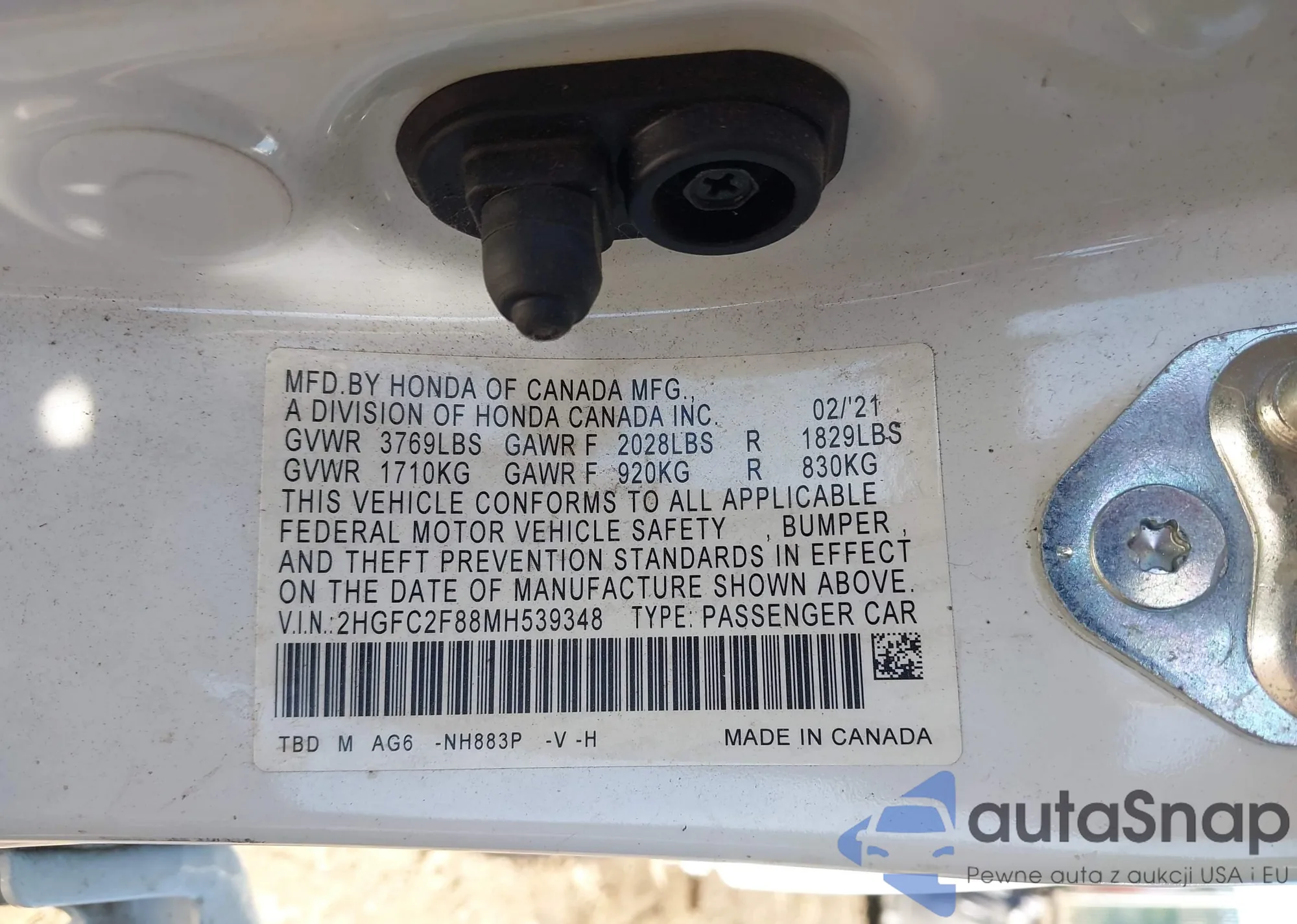 LOT: 43437700 VIN: 2HGFC2F88MH539348