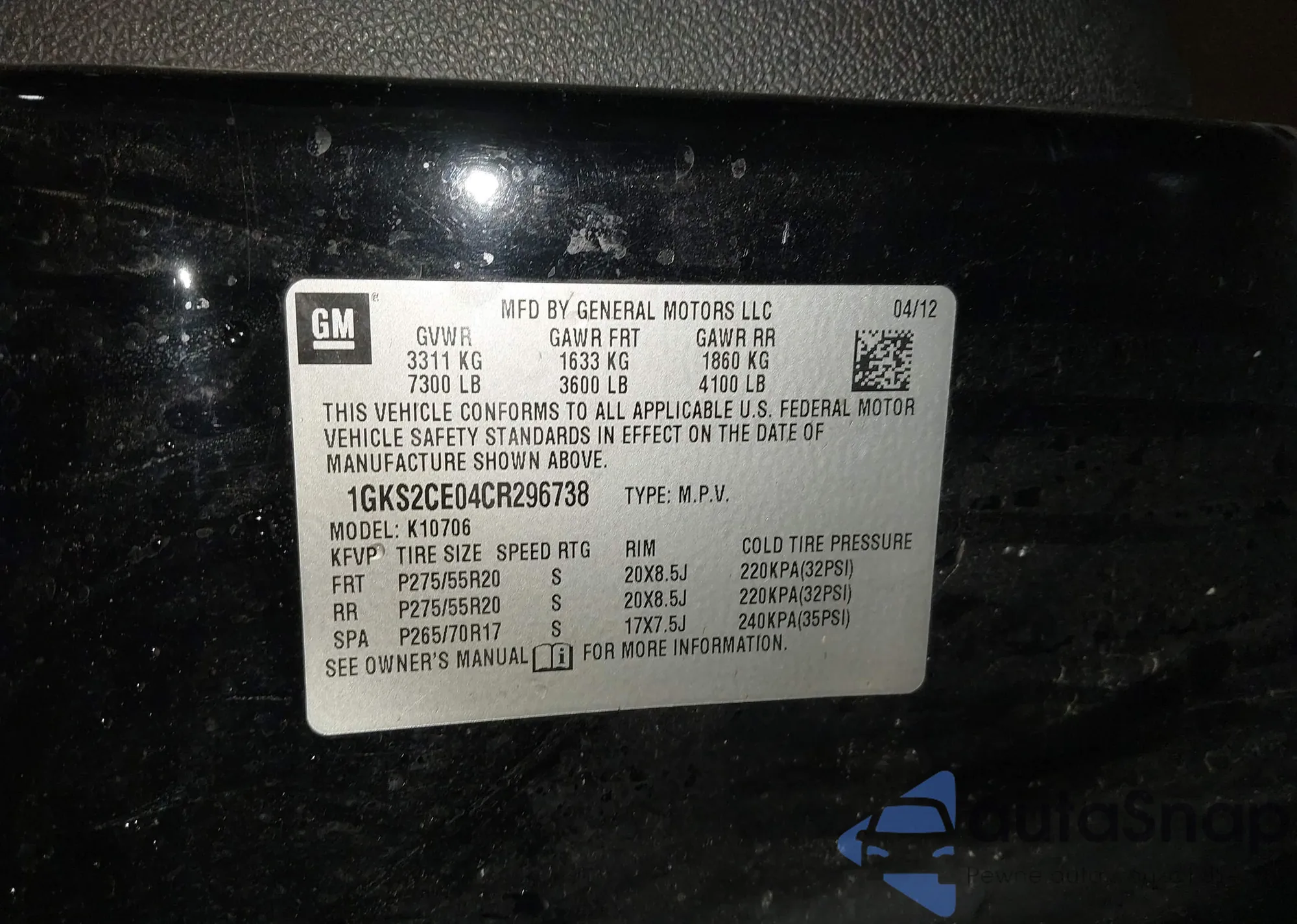 • VIN 1GKS2CE04CR296738