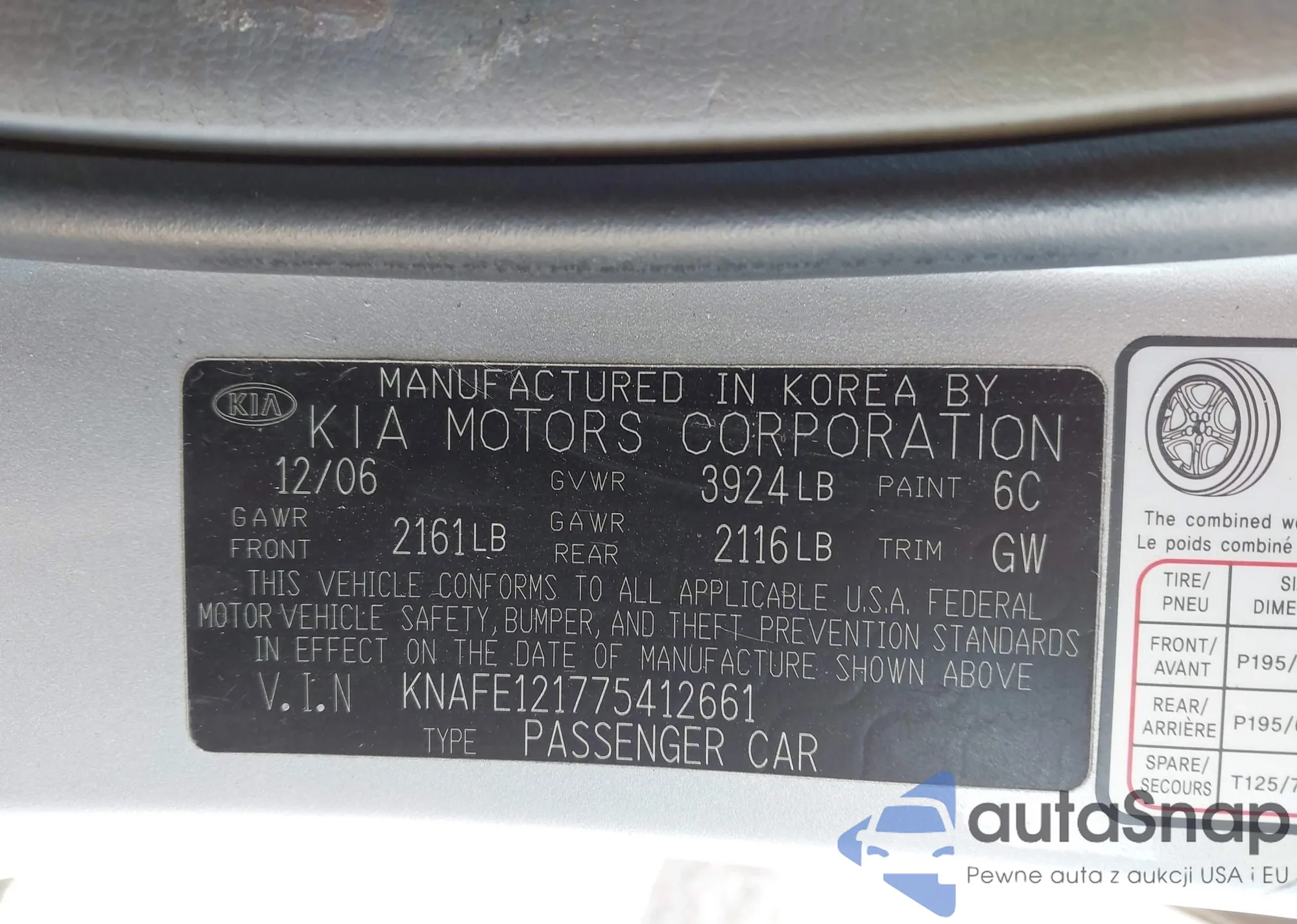 LOT: 43965574 VIN: KNAFE121775412661