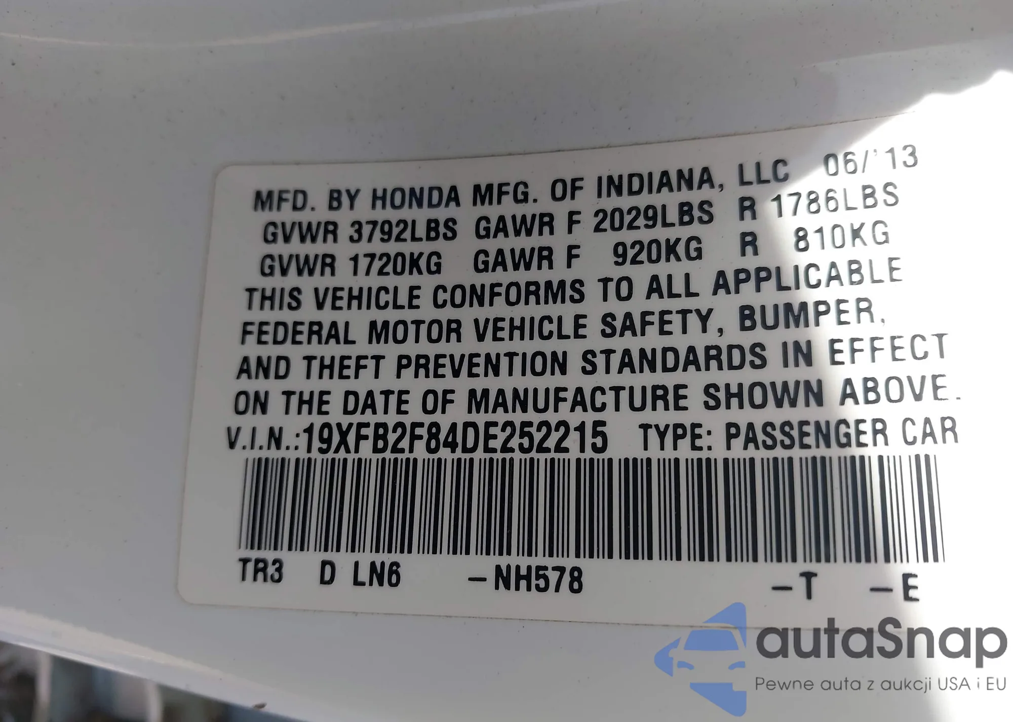 LOT: 43992381 VIN: 19XFB2F84DE252215