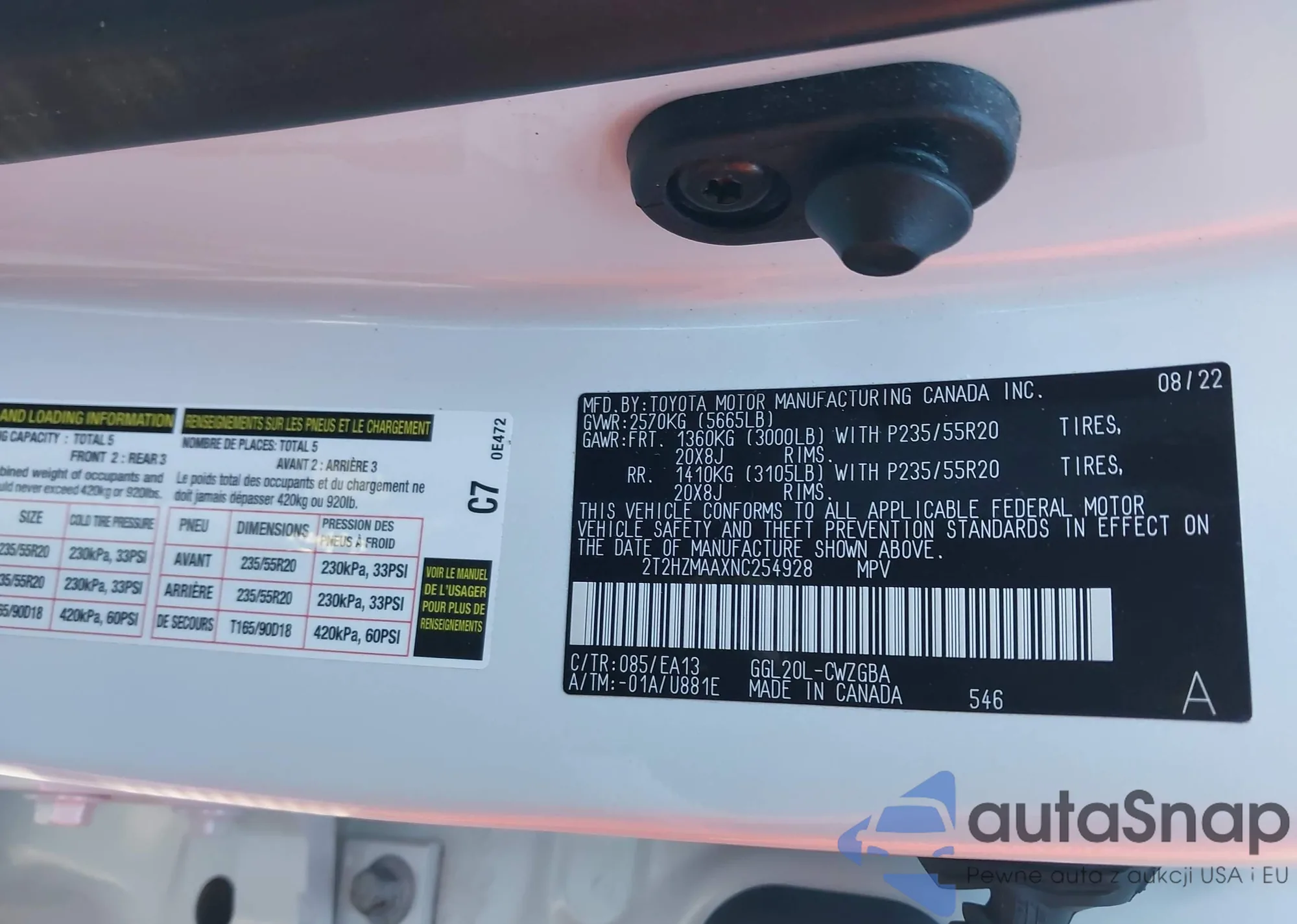 LOT: 44037211 VIN: 2T2HZMAAXNC254928