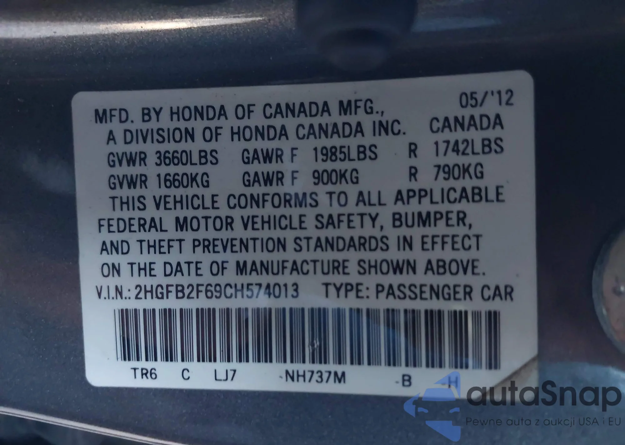 • VIN 2HGFB2F69CH574013