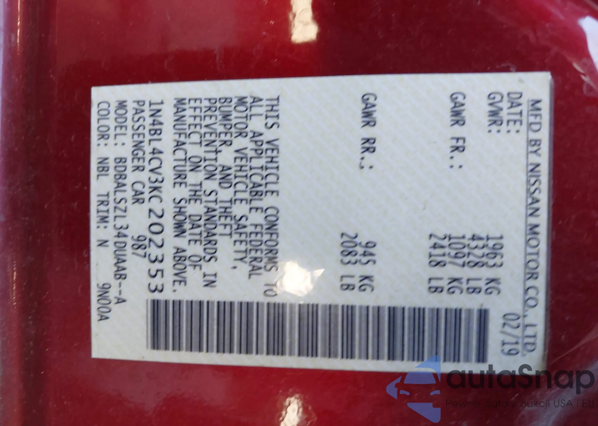 LOT: 43701494 VIN: 1N4BL4CV3KC202353