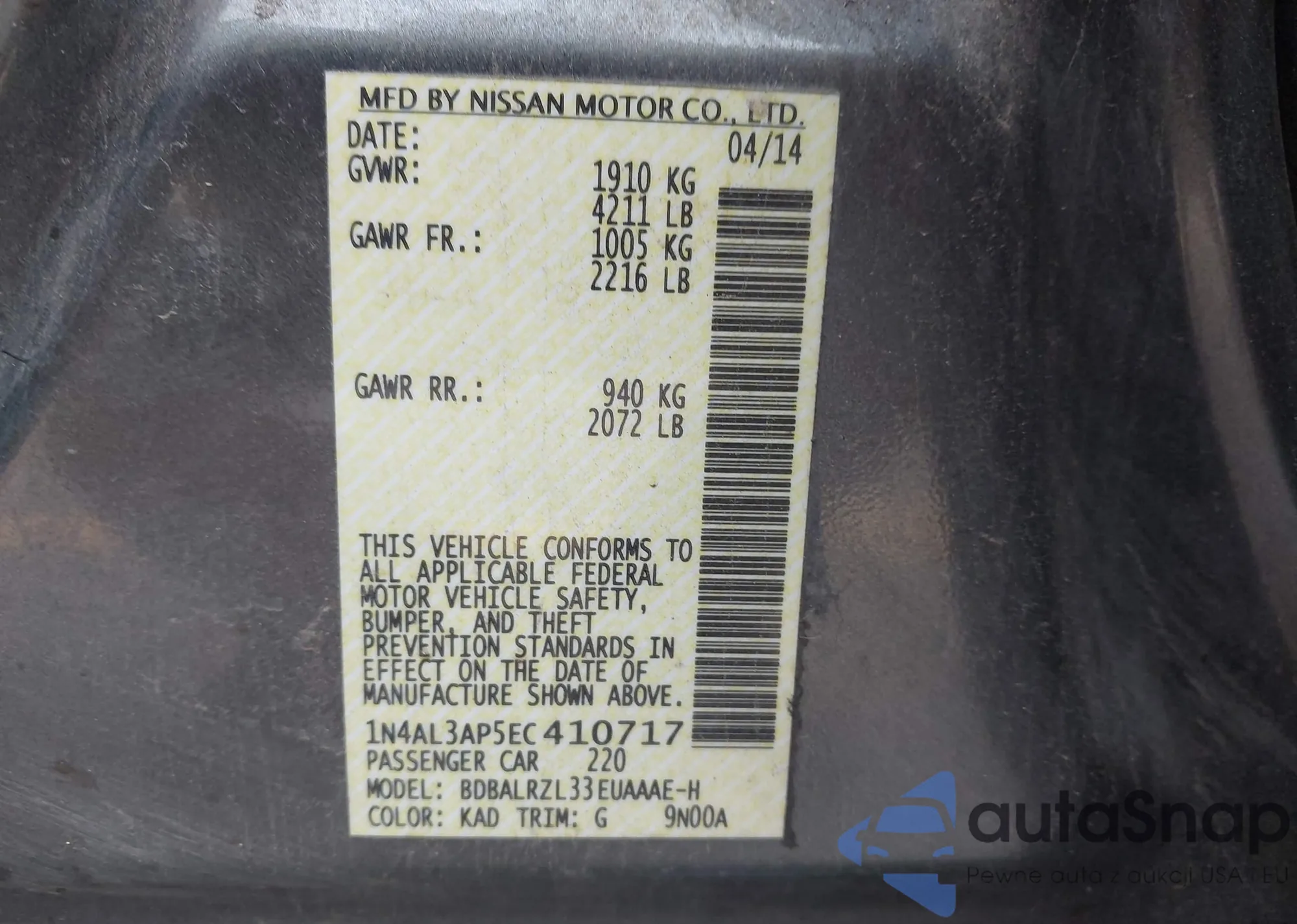 LOT: 43889009 VIN: 1N4AL3AP5EC410717