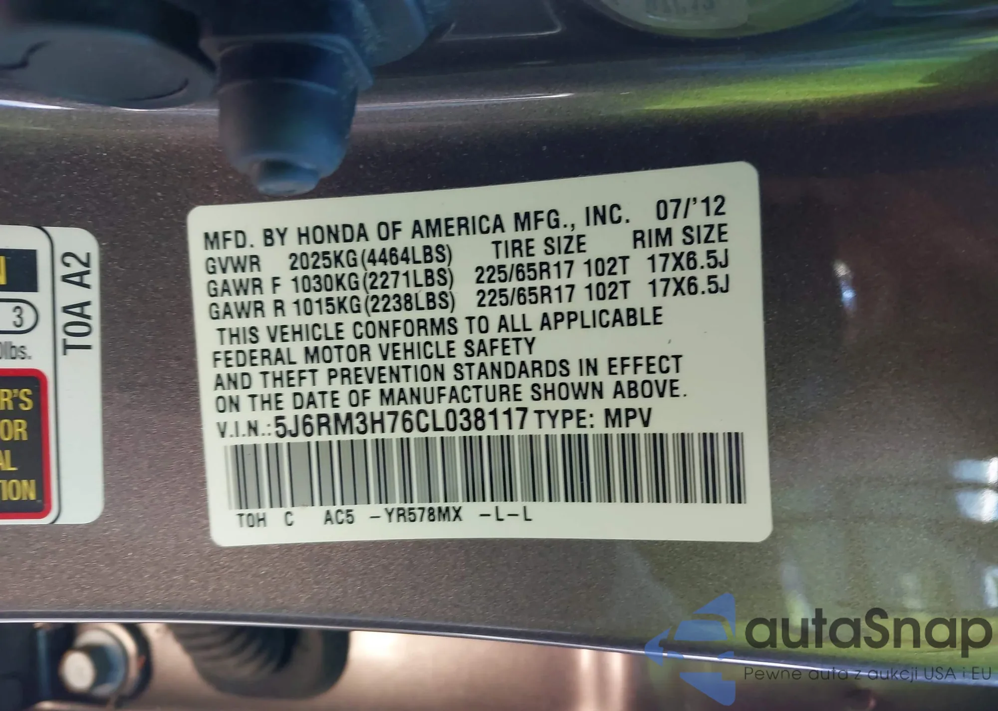 • VIN 5J6RM3H76CL038117