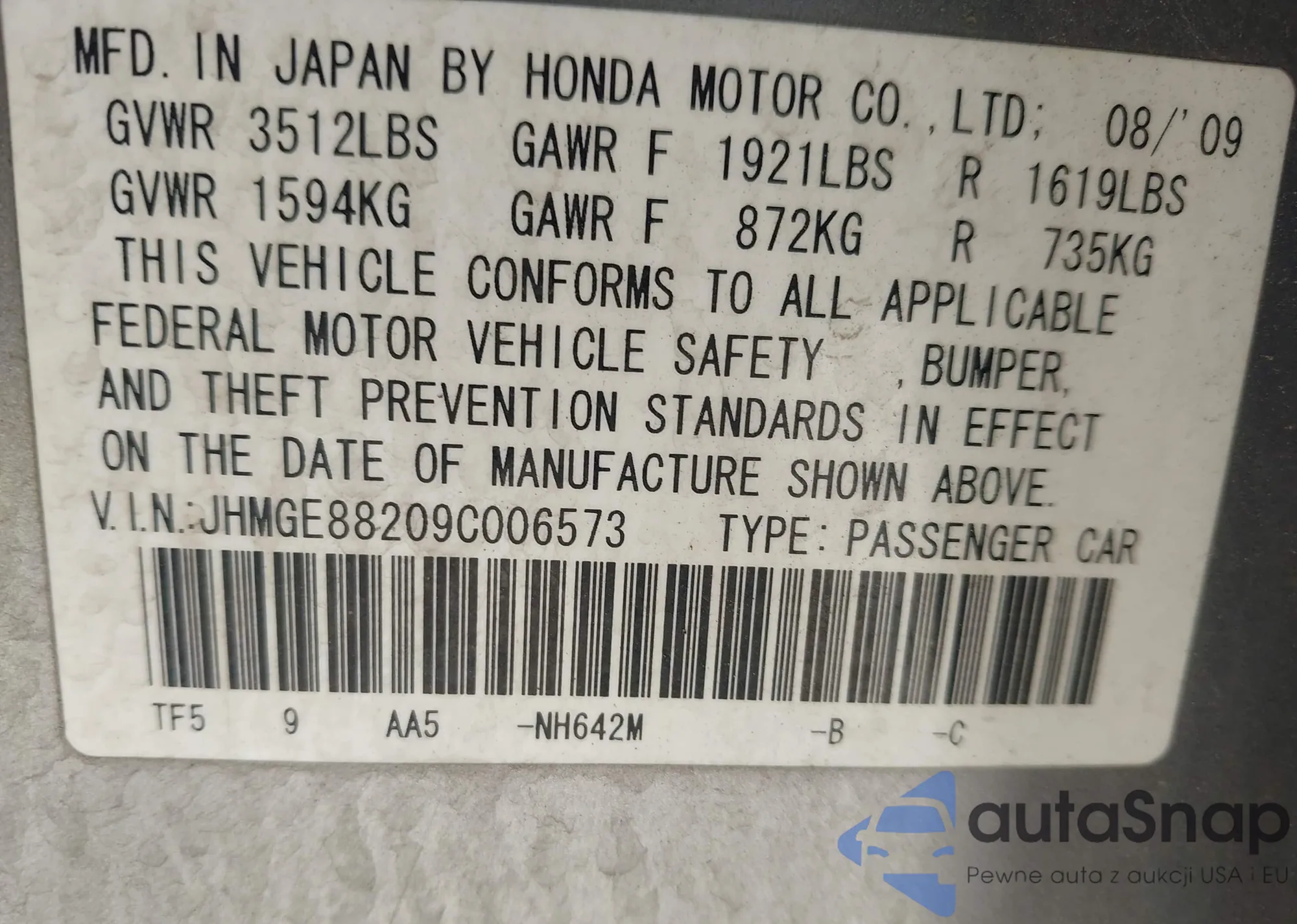 LOT: 44175194 VIN: JHMGE88209C006573