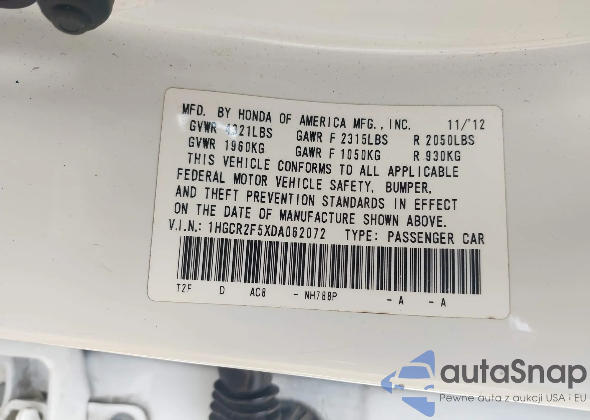 • VIN 1HGCR2F5XDA062072