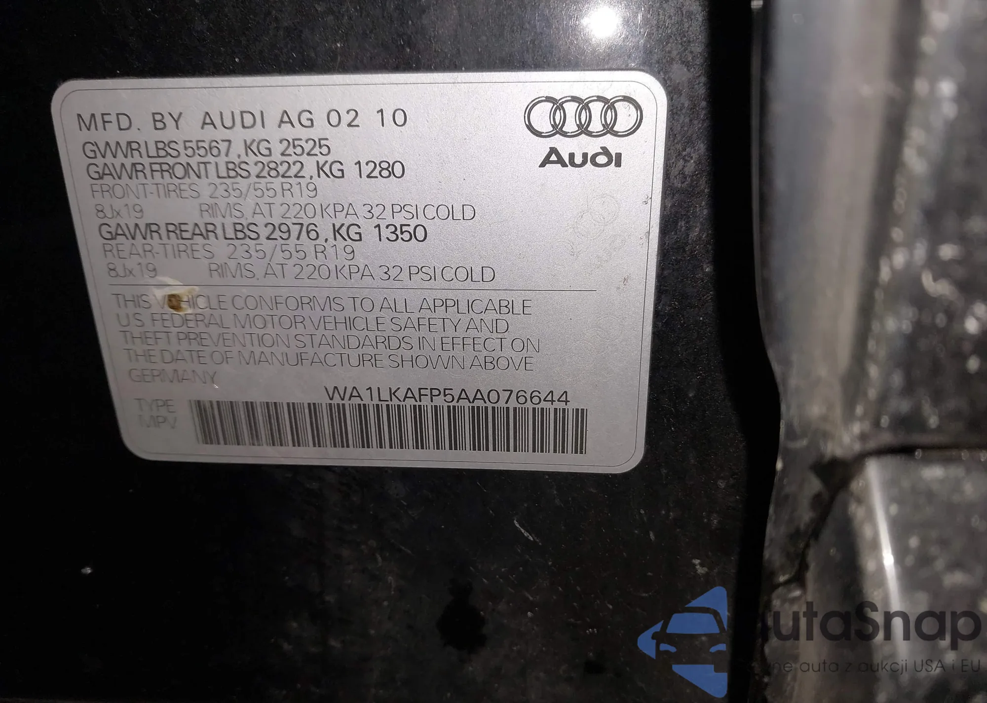 2010 Audi Q5 3.2 Premium from USA, damaged, VIN WA1LKAFP5AA076644