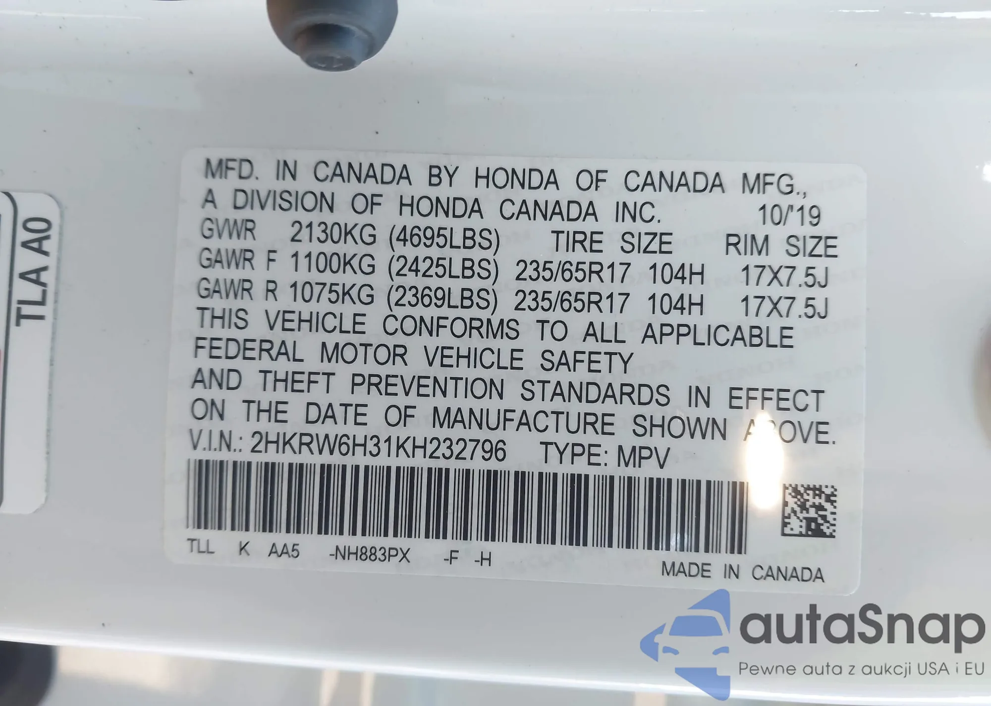 • VIN 2HKRW6H31KH232796