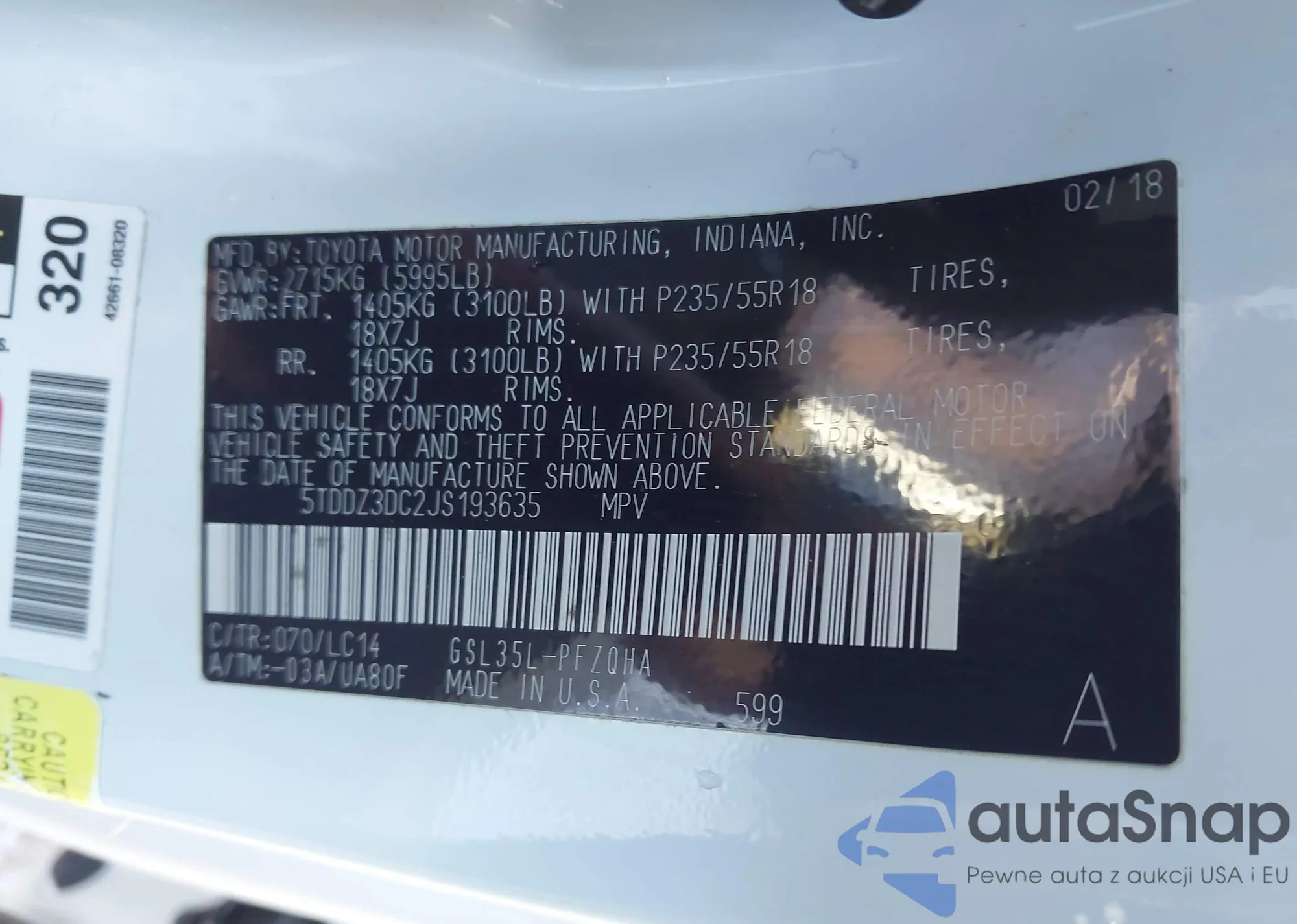 LOT: 43797730 VIN: 5TDDZ3DC2JS193635