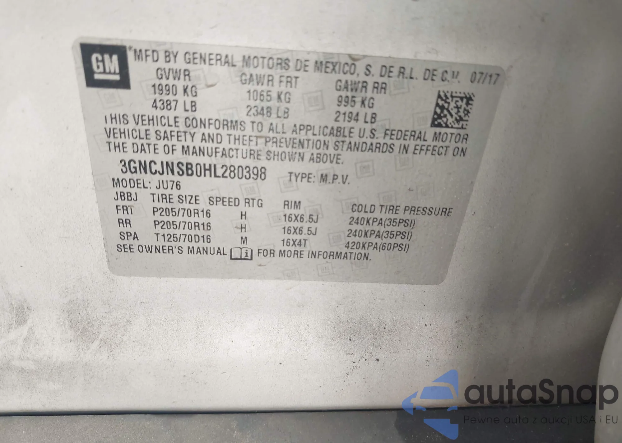 • VIN 3GNCJNSB0HL280398