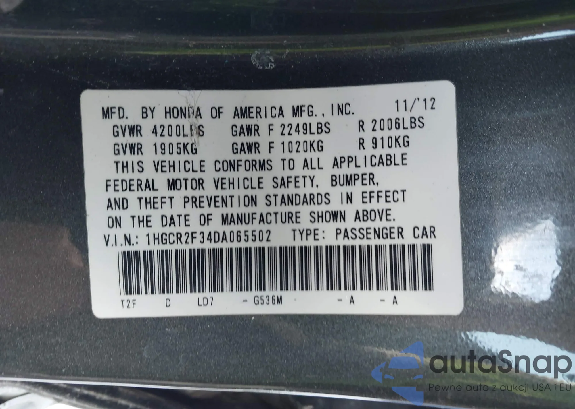• VIN 1HGCR2F34DA065502