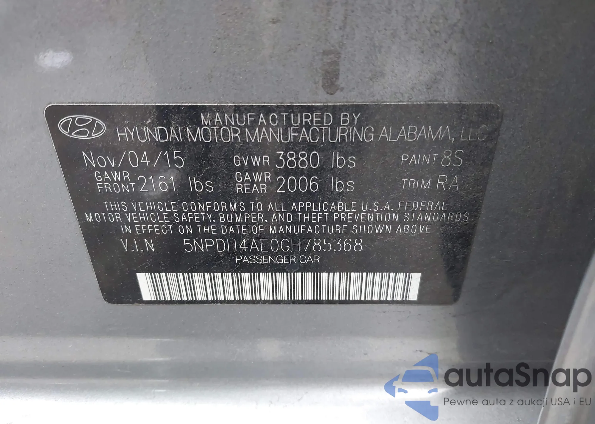 LOT: 43868508 VIN: 5NPDH4AE0GH785368