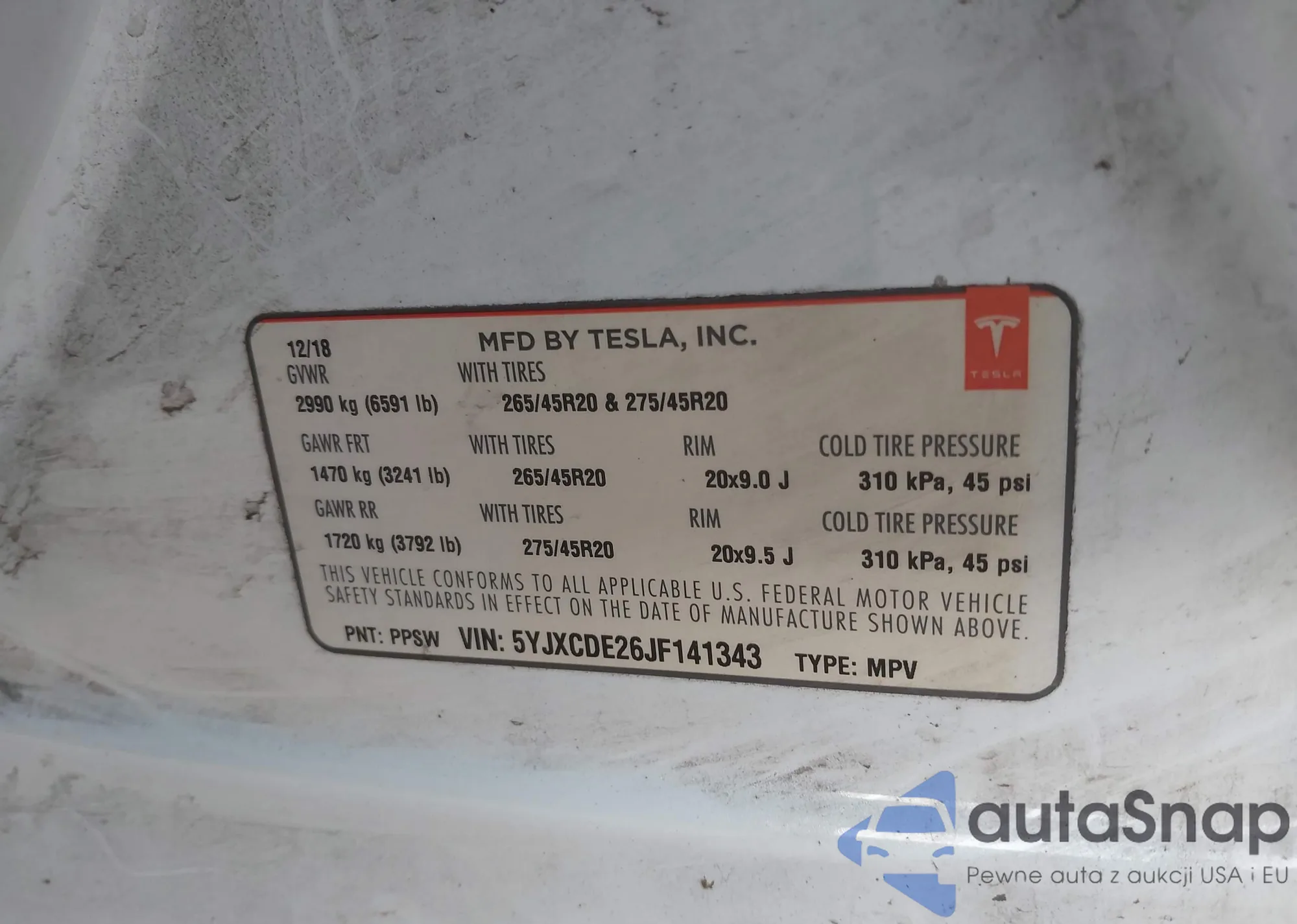 LOT: 43834334 VIN: 5YJ3E1EA2JF014667