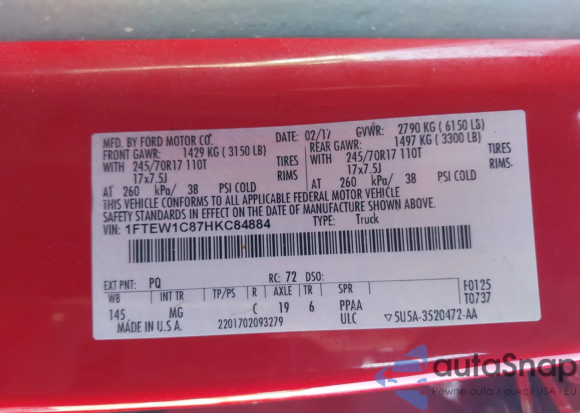 LOT: 43771397 VIN: 1FTEW1C87HKC84884