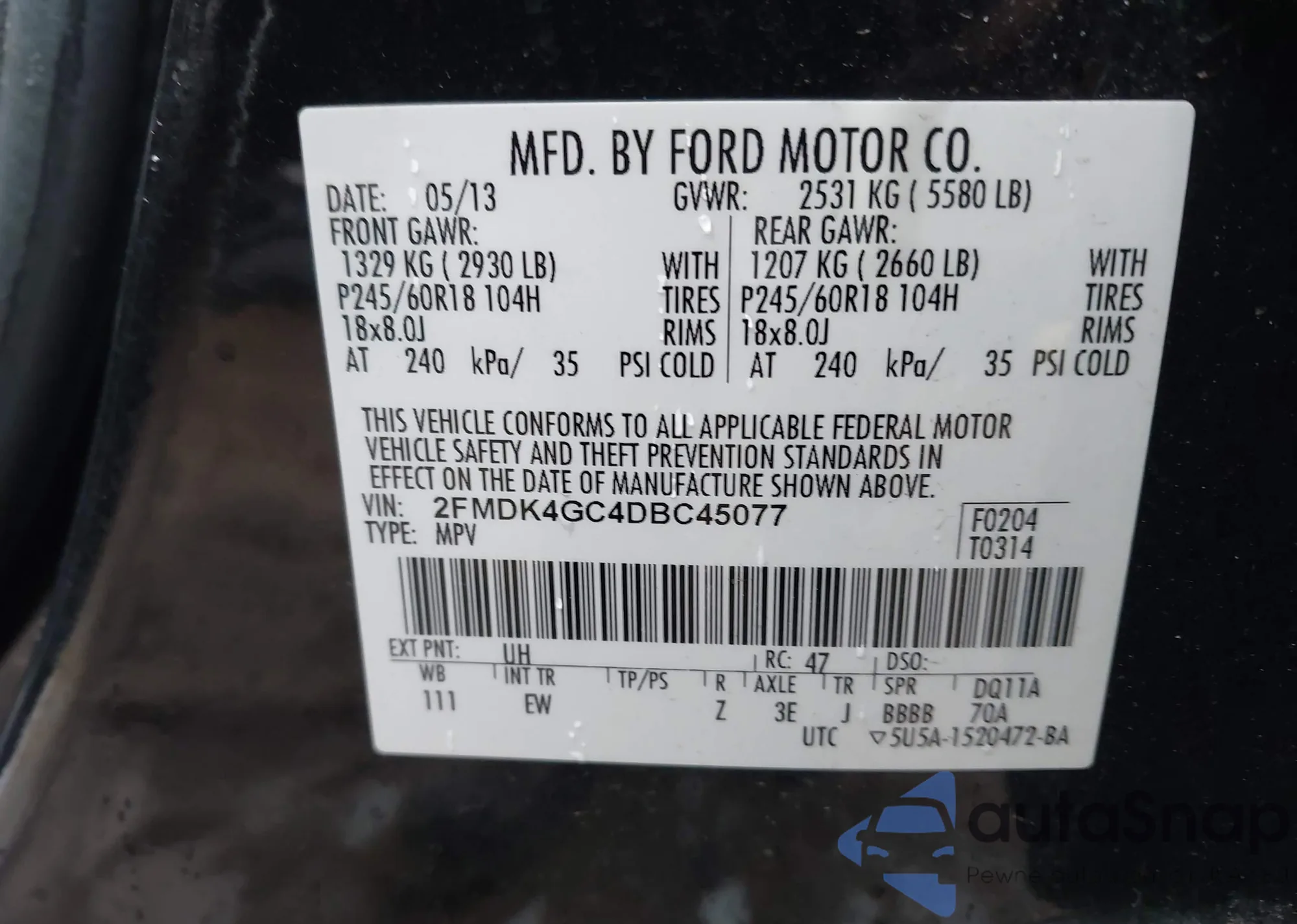 LOT: 43949910 VIN: 2FMDK4GC4DBC45077