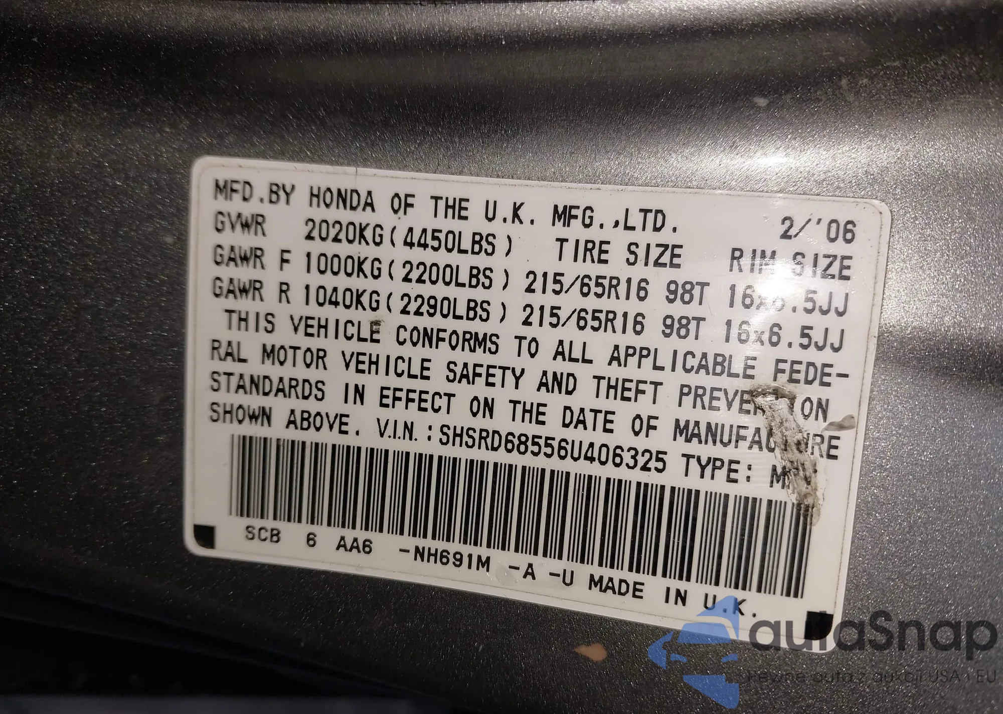 • VIN SHSRD68556U406325