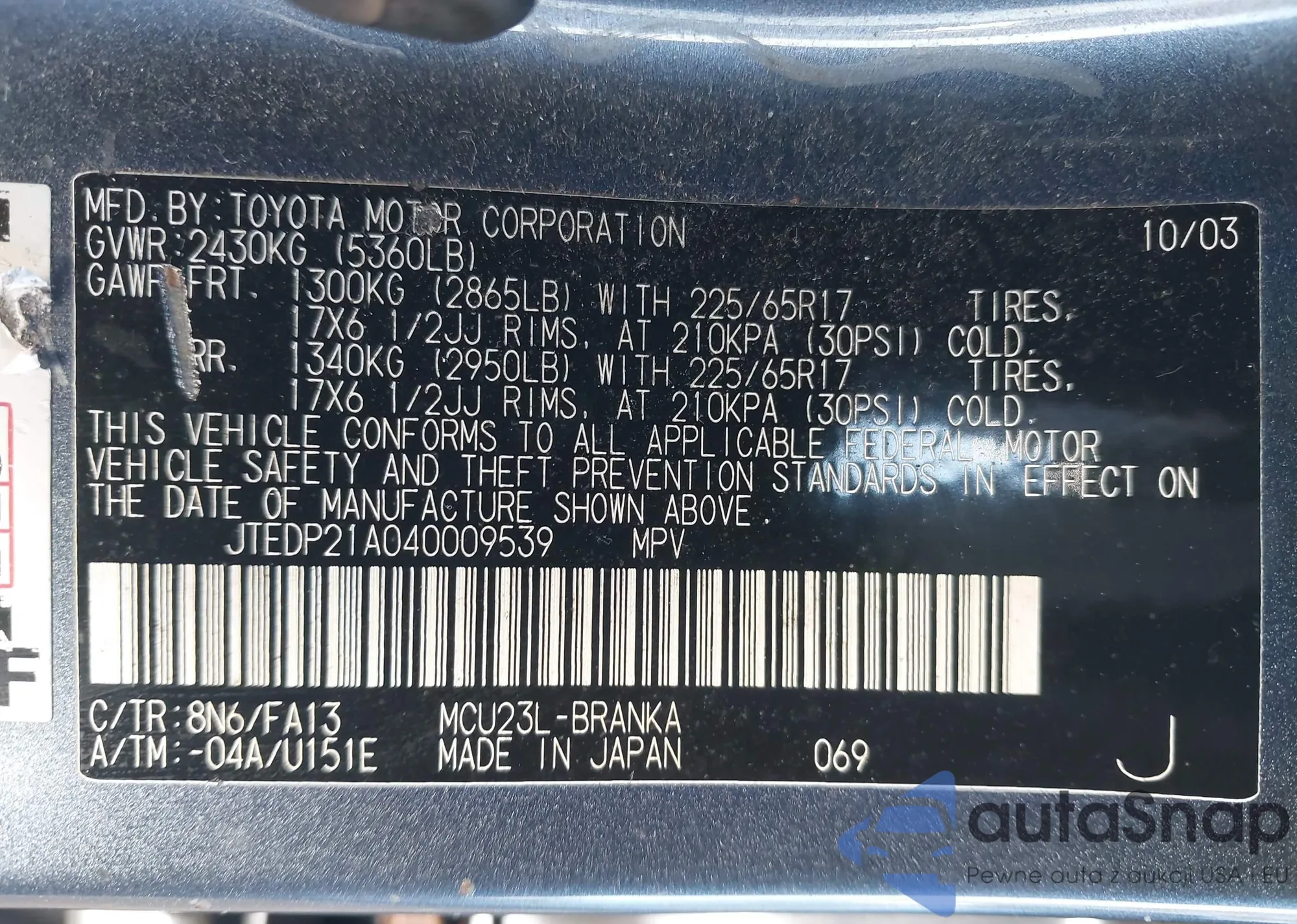 LOT: 44013347 VIN: JTEDP21A040009539