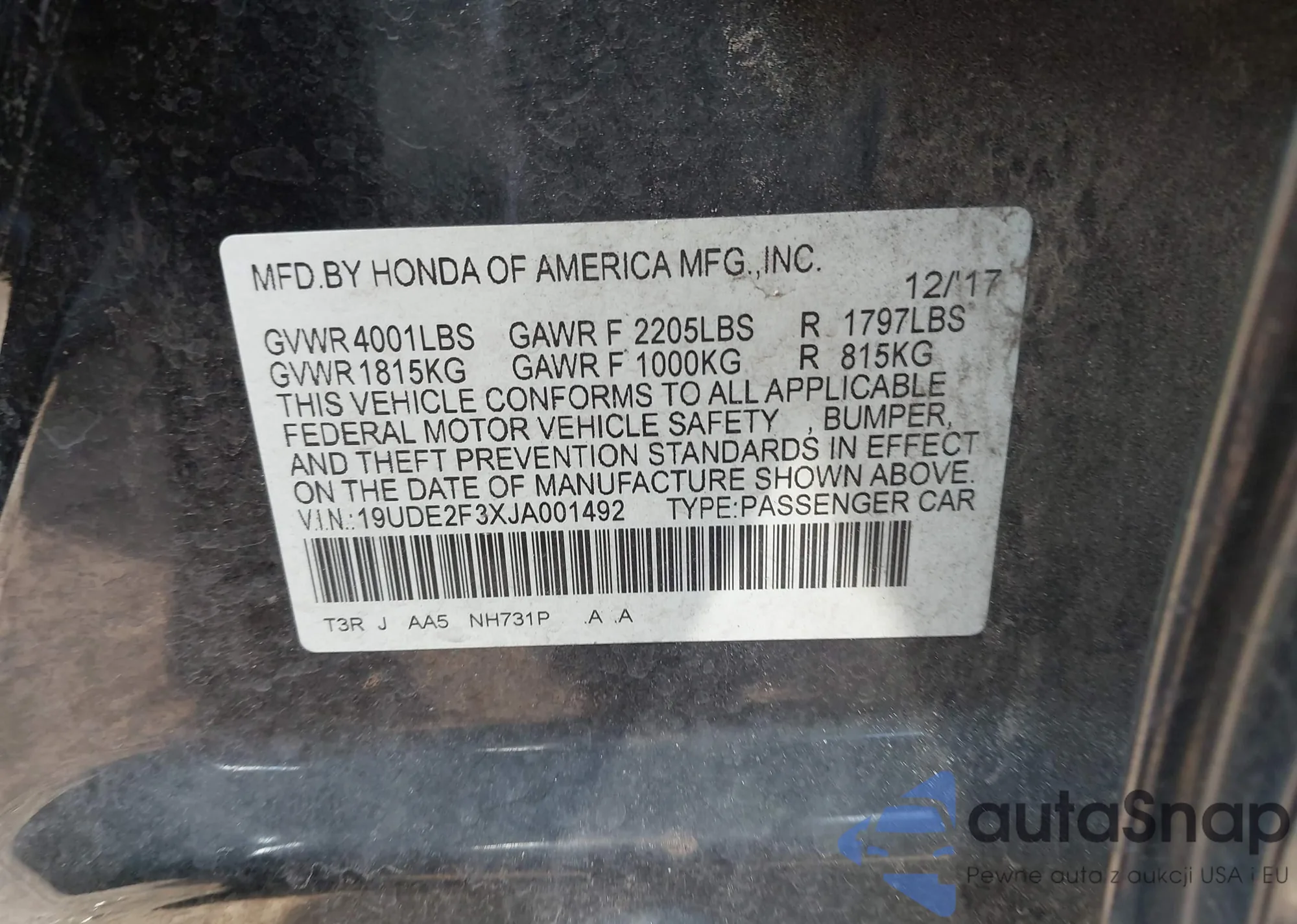 LOT: 43944331 VIN: 19UDE2F3XJA001492
