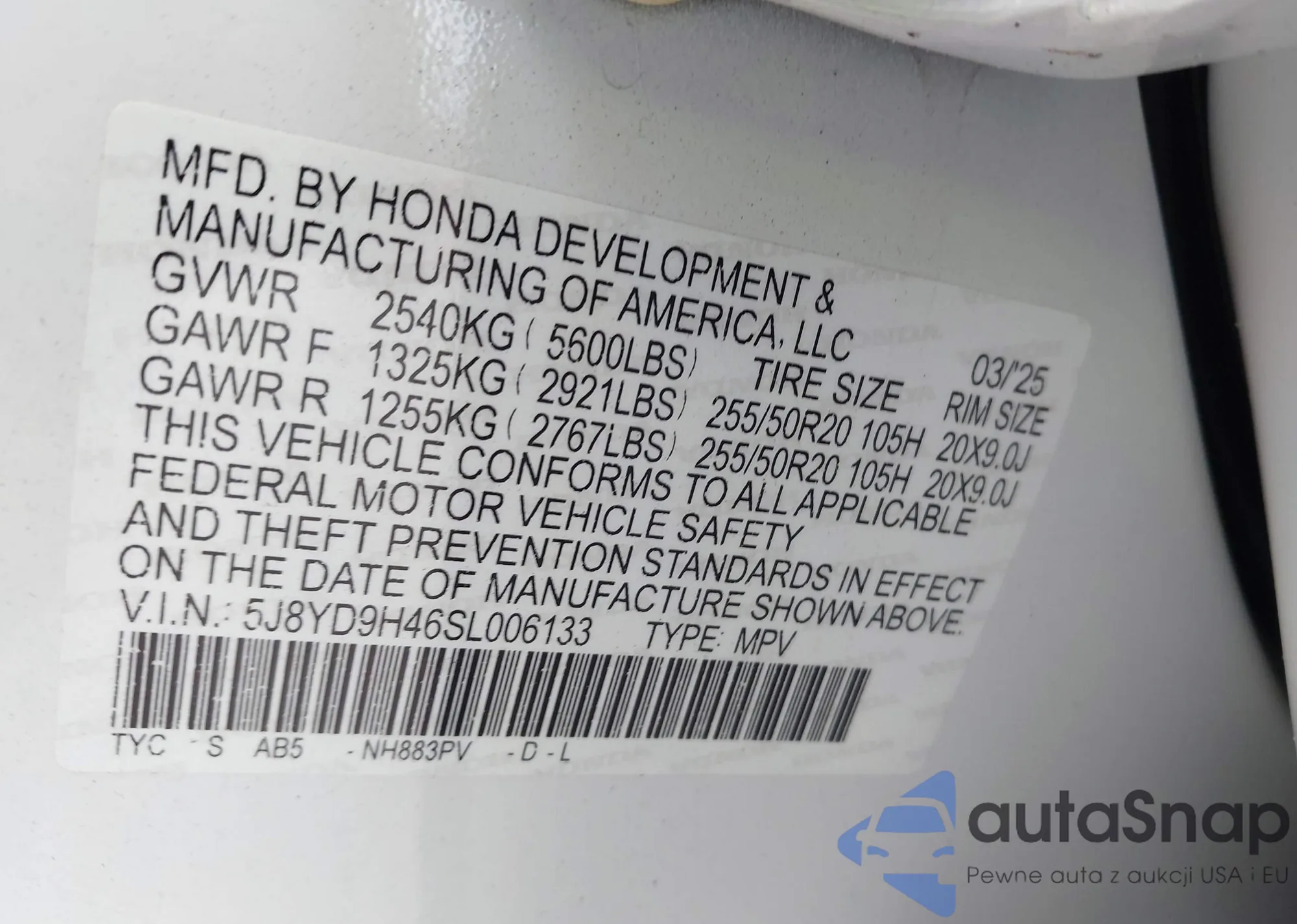 LOT: 44130455 VIN: 5J8YD9H46SL006133