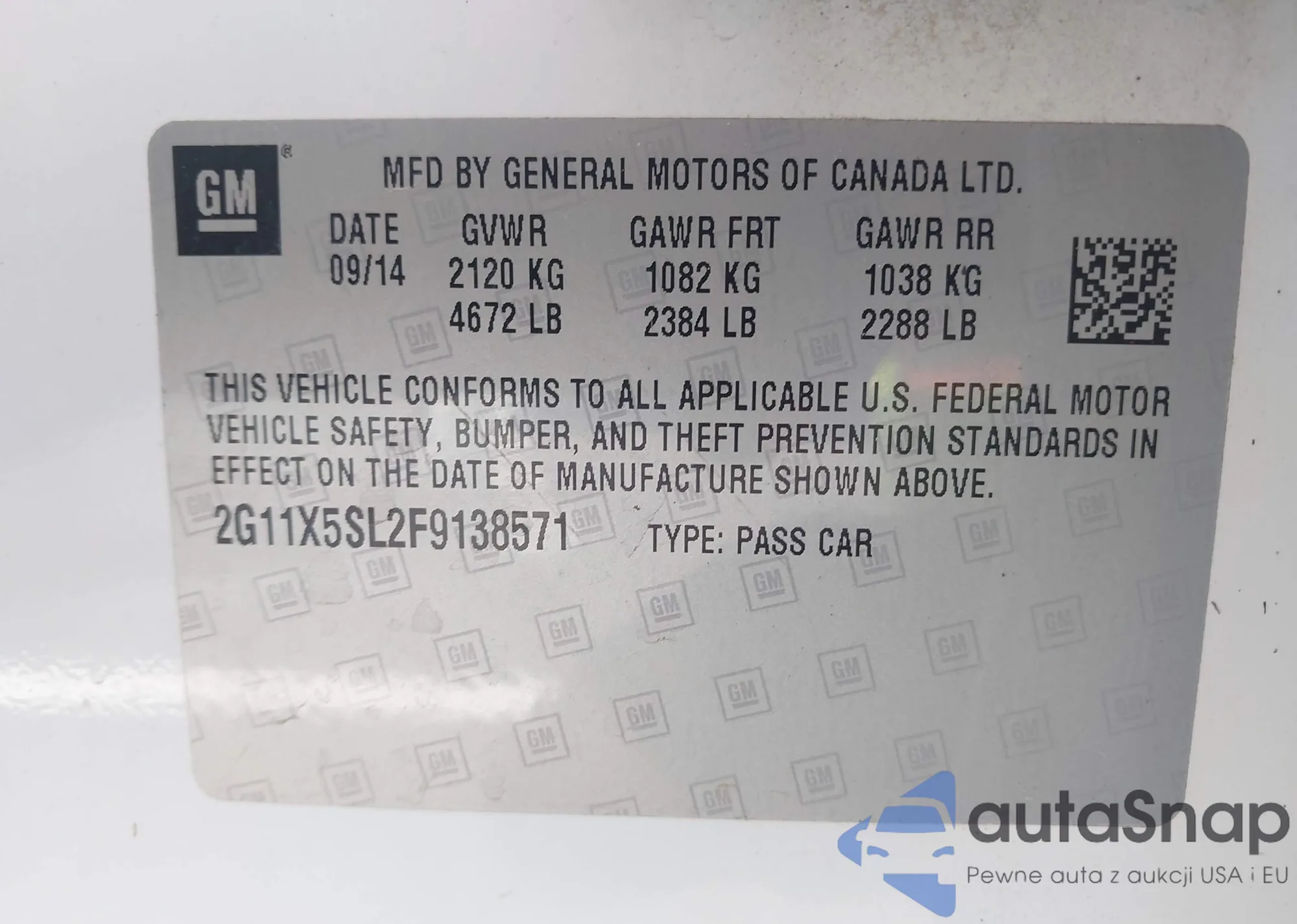 LOT: 43490197 VIN: 2G11X5SL2F9138571