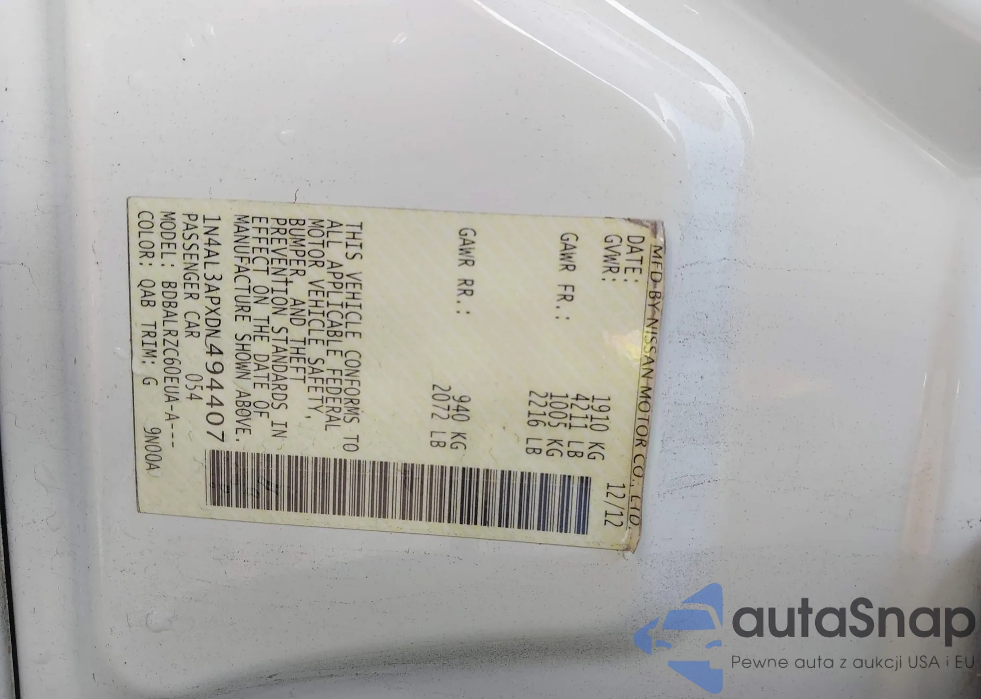 LOT: 43612823 VIN: 1N4BL4BV9KC151409