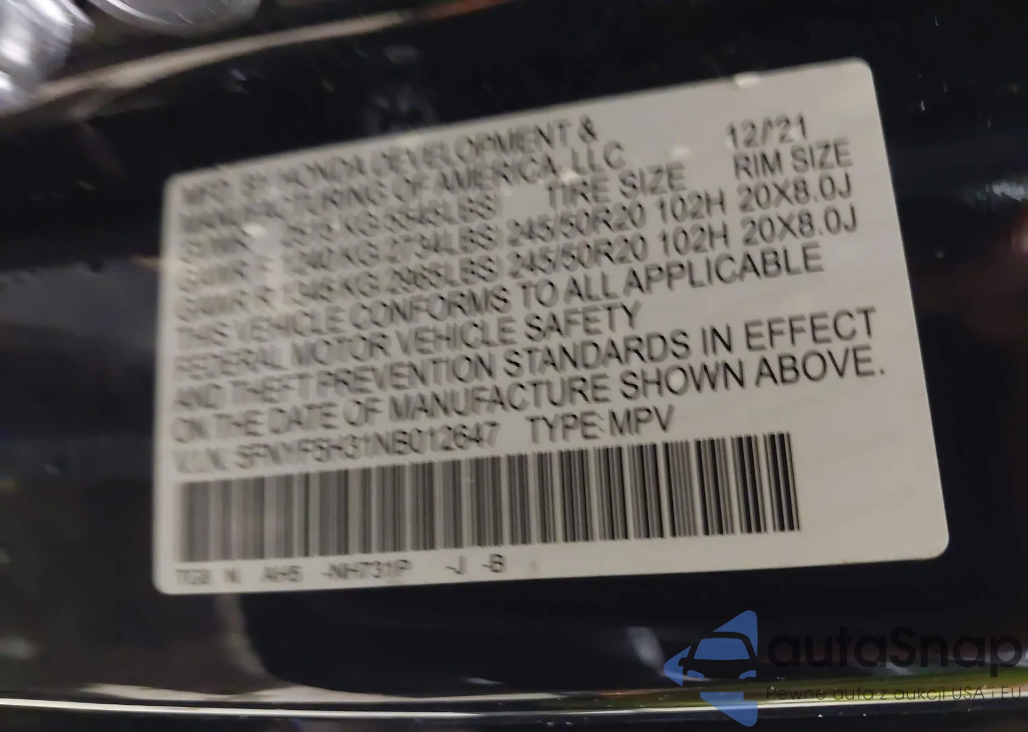 LOT: 43826432 VIN: 5FNYF5H31NB012647