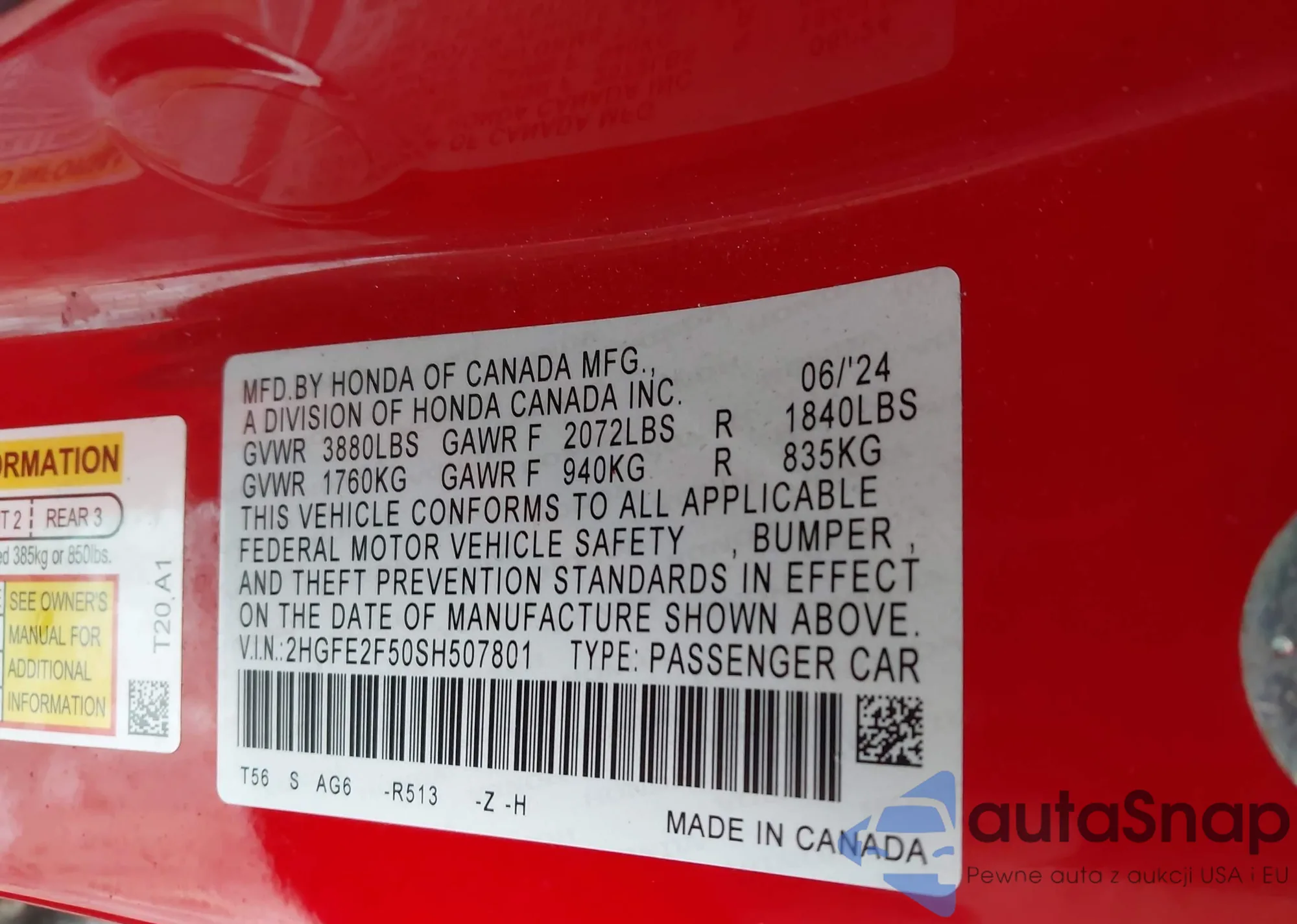 • VIN 2HGFE2F50SH507801