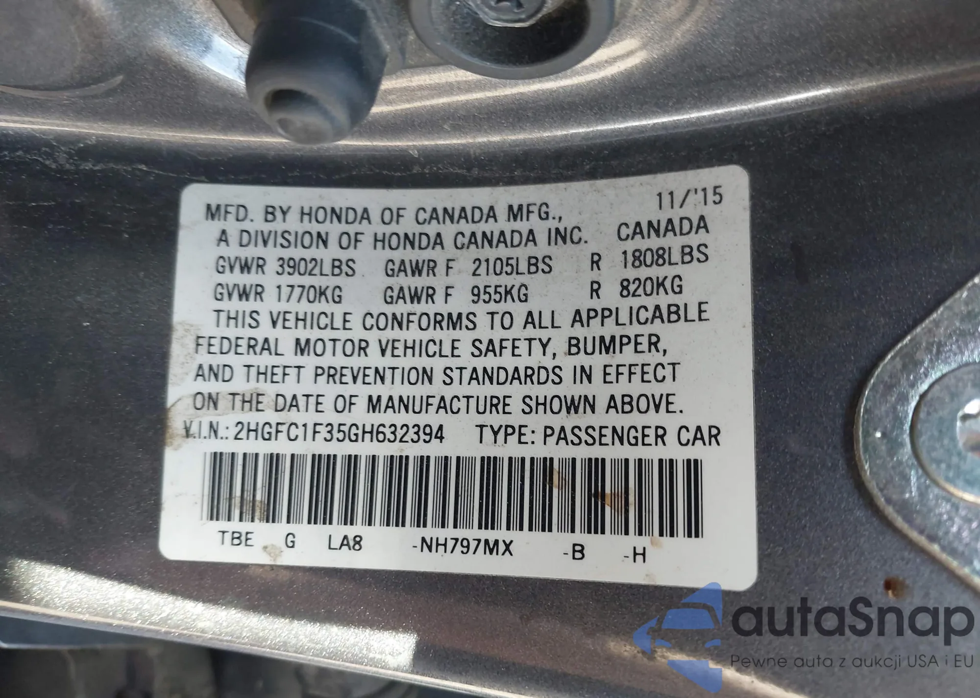 LOT: 43958337 VIN: 2HGFC1F35GH632394