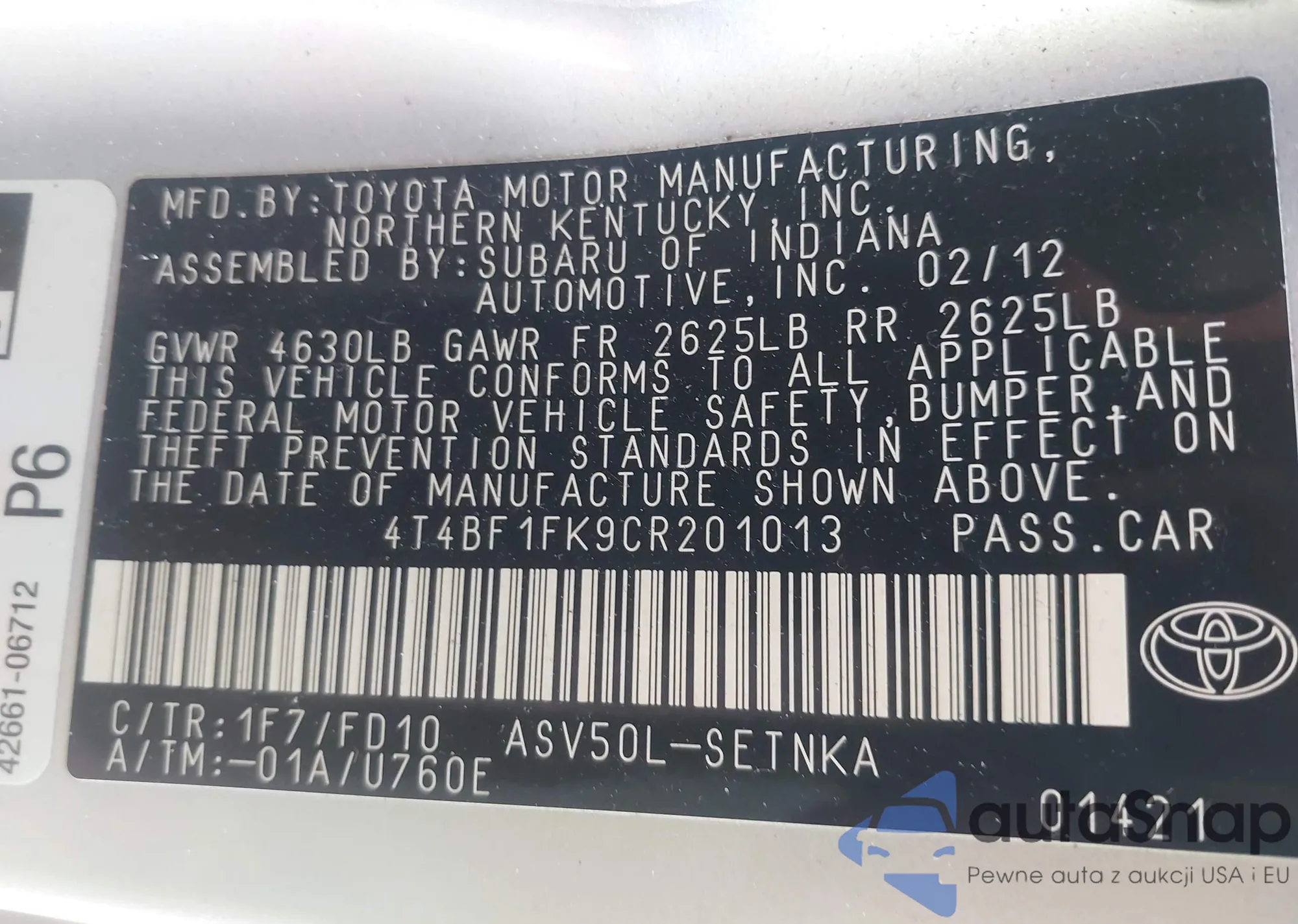 • VIN 4T4BF1FK9CR201013