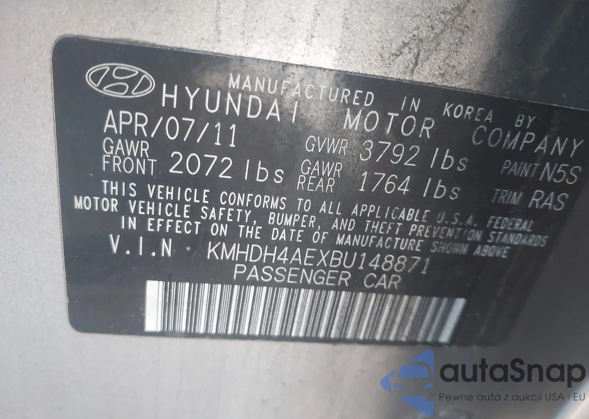 LOT: 44170484 VIN: KMHDH4AEXBU148871