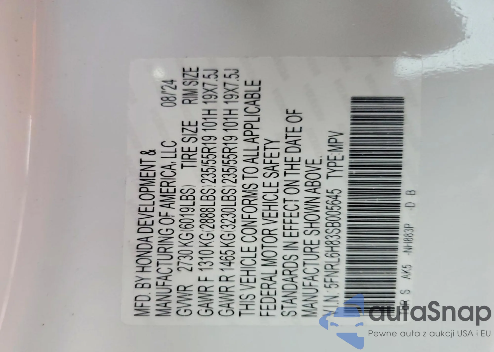 • VIN 5FNRL6H83SB005645