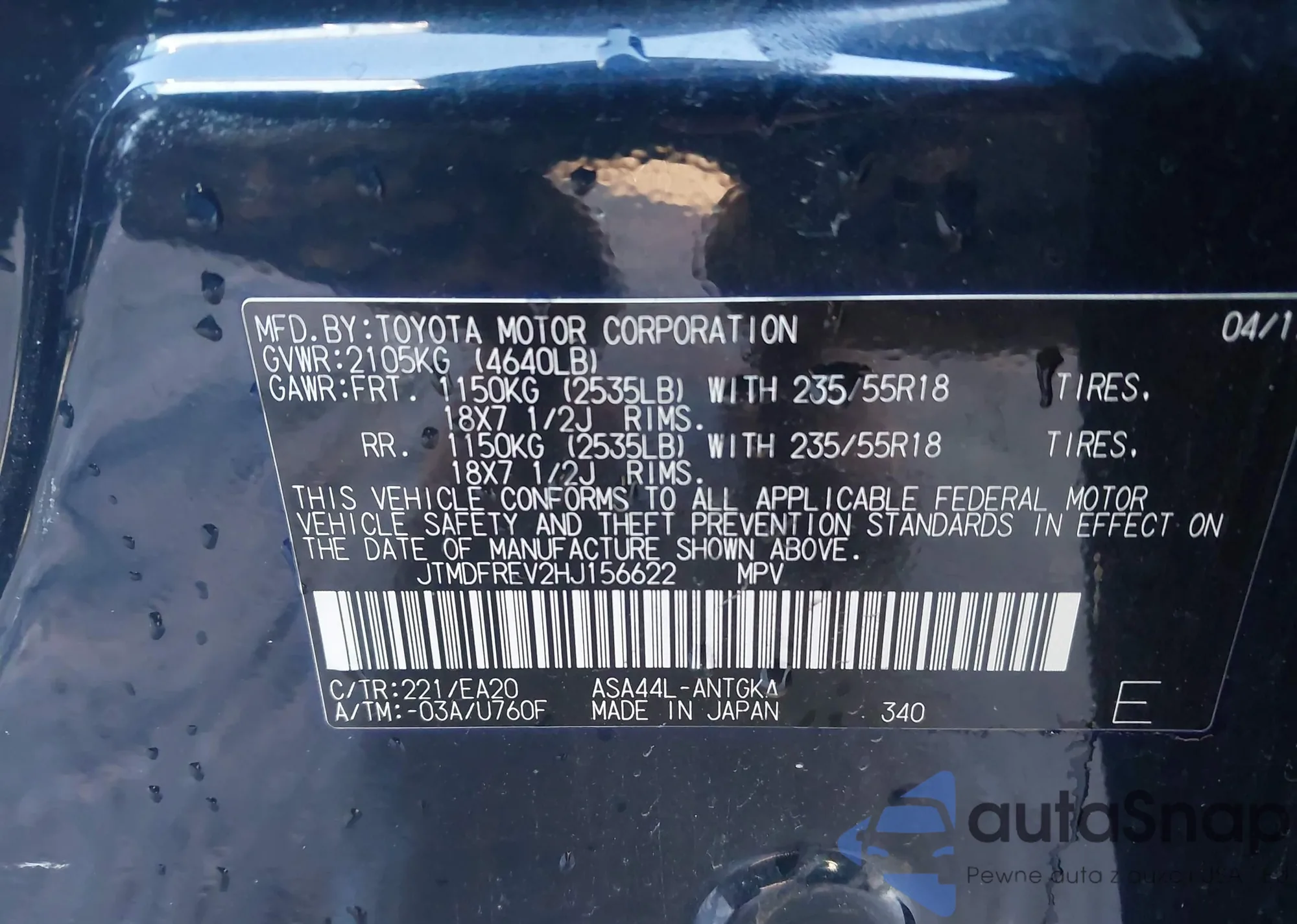 LOT: 43960207 VIN: JTMDFREV2HJ156622