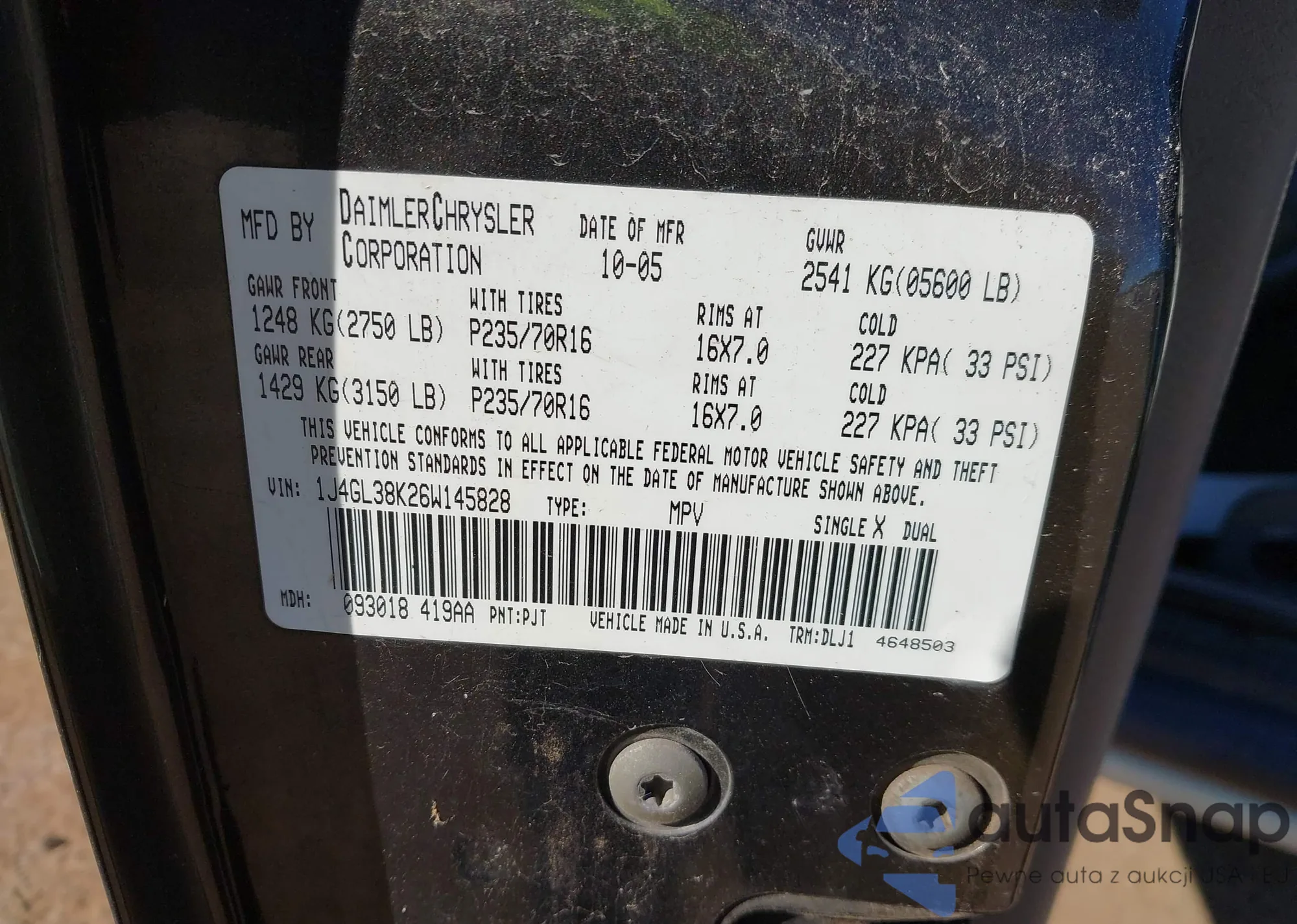 LOT: 44116108 VIN: 1J4GL38K26W145828
