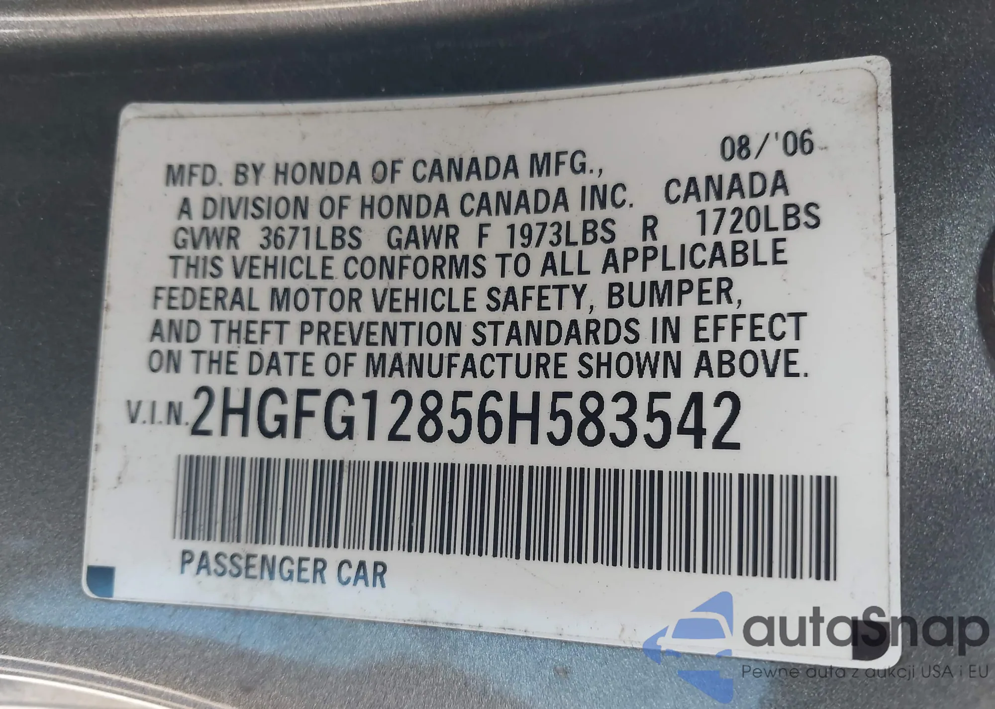 LOT: 44139006 VIN: 2HGFG12856H583542