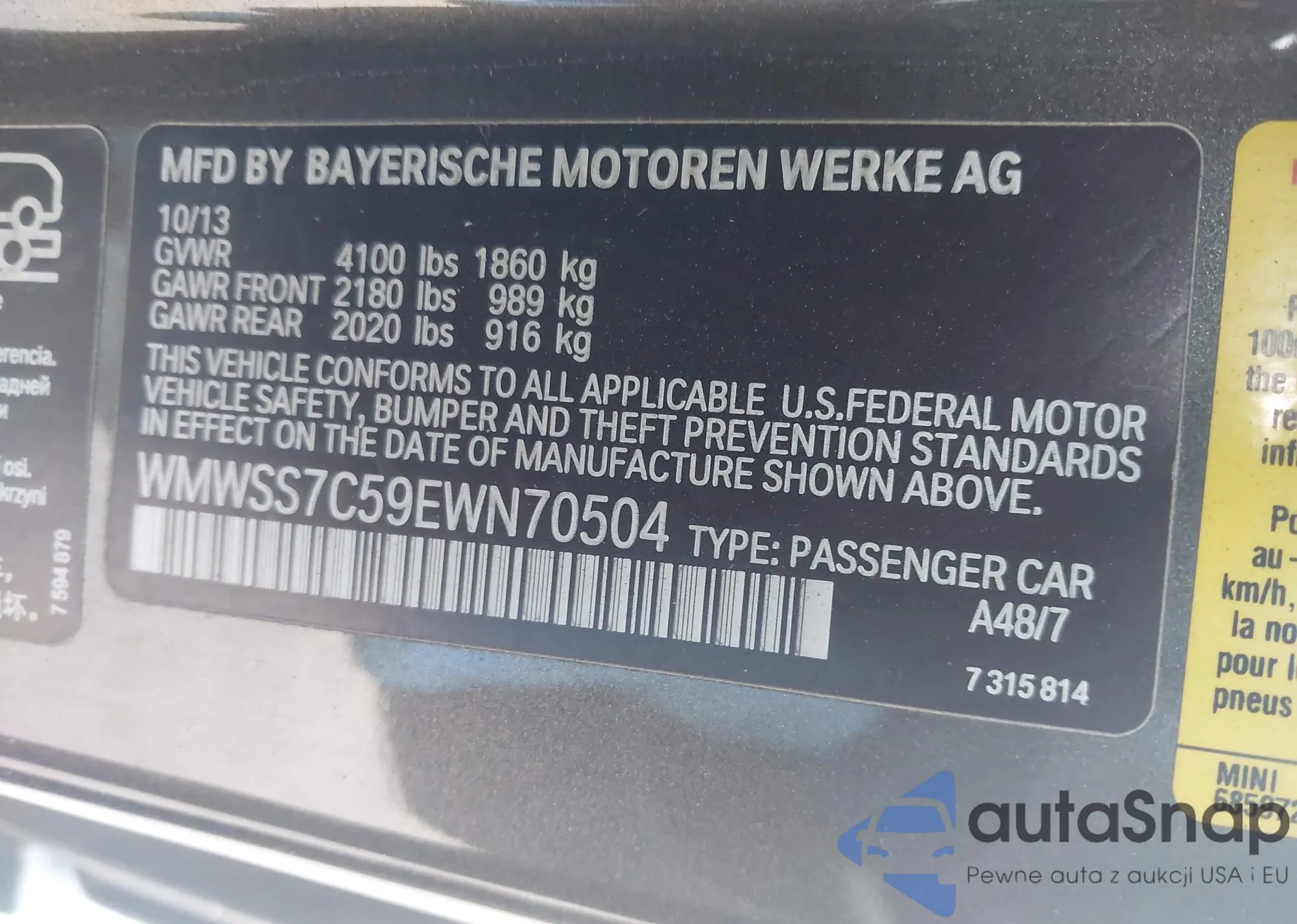 LOT: 43765952 VIN: WMWSS7C59EWN70504