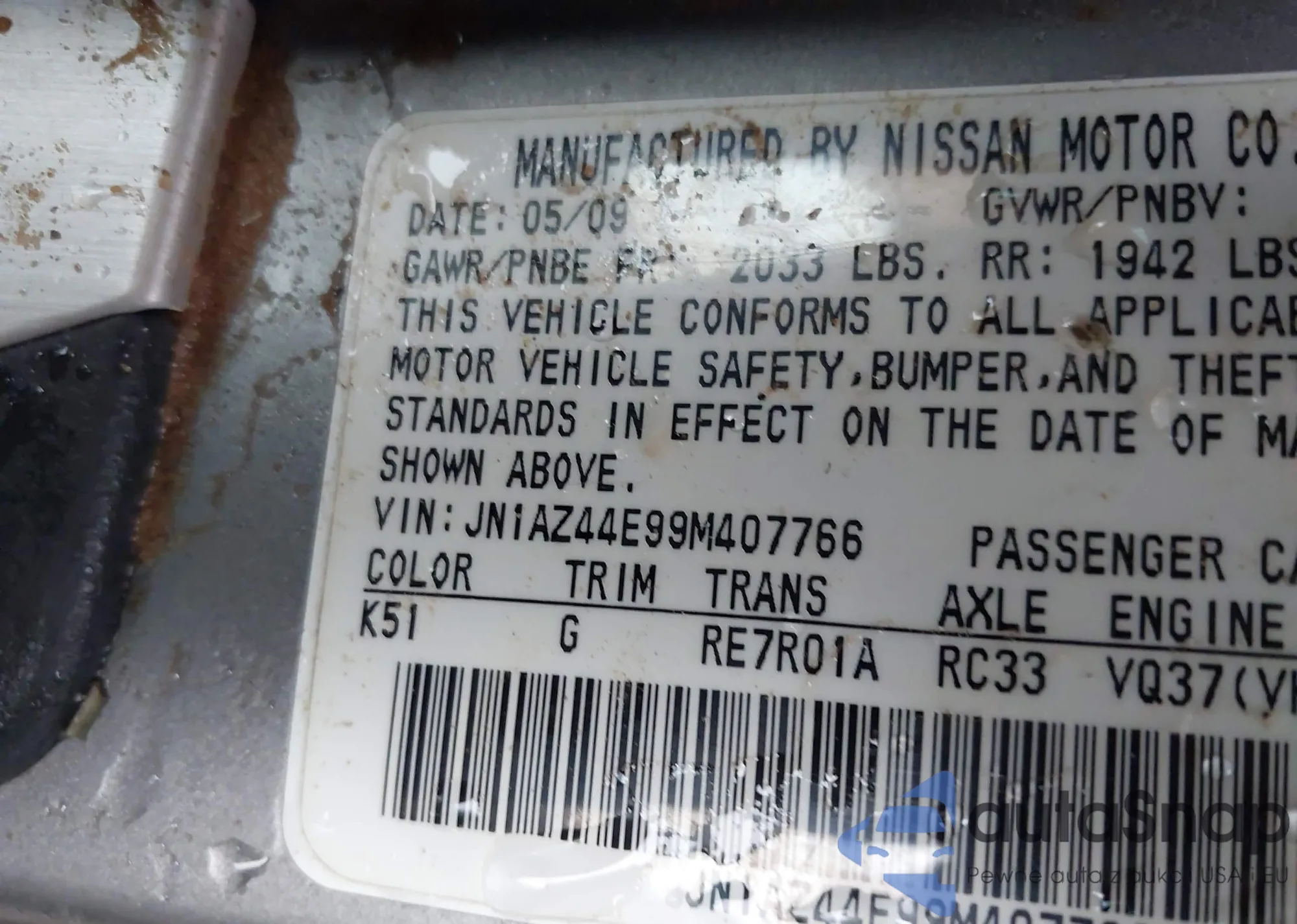 LOT: 43865445 VIN: JN1AZ44E99M407766