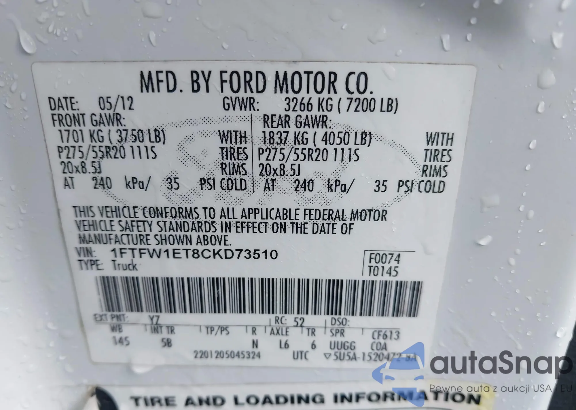 • VIN 1FTFW1ET8CKD73510