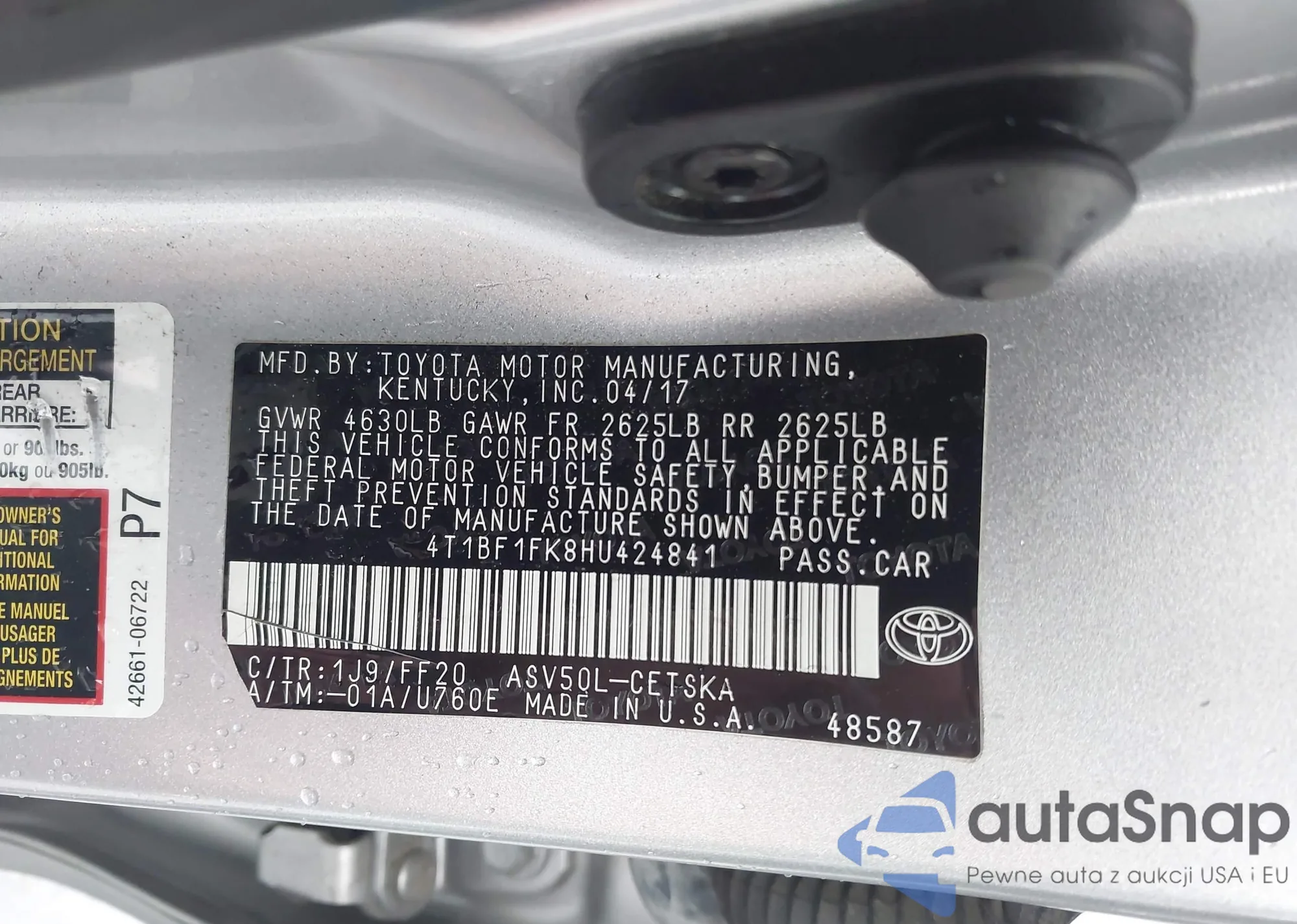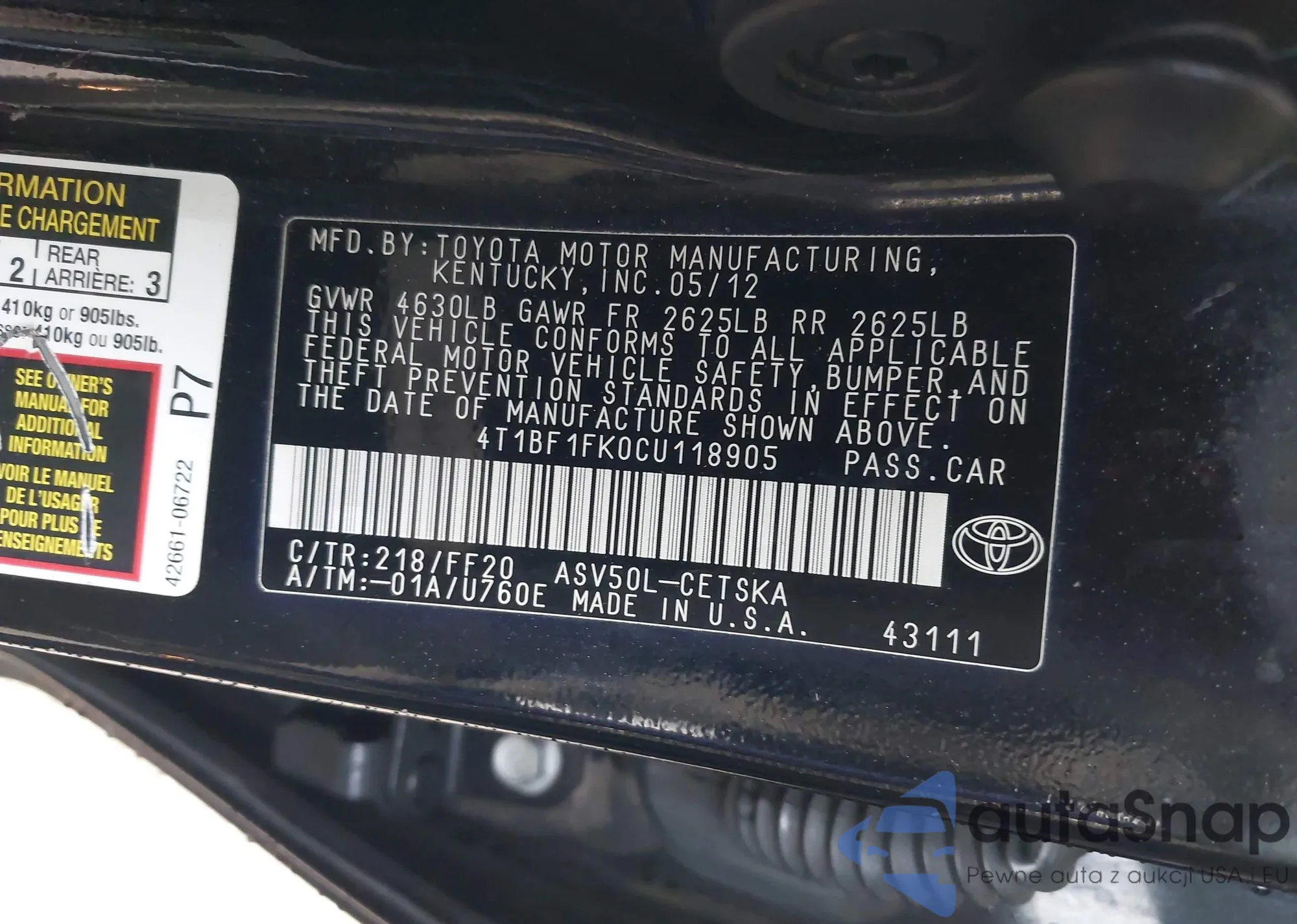 • VIN 4T1BF1FK0CU118905