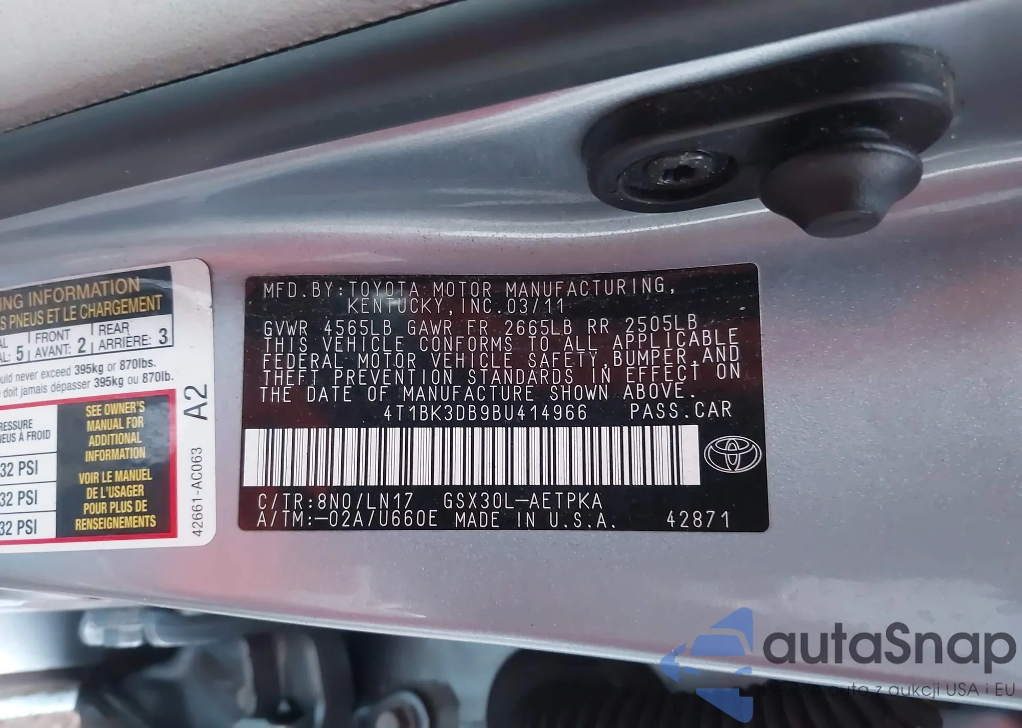 • VIN 4T1BK3DB9BU414966
