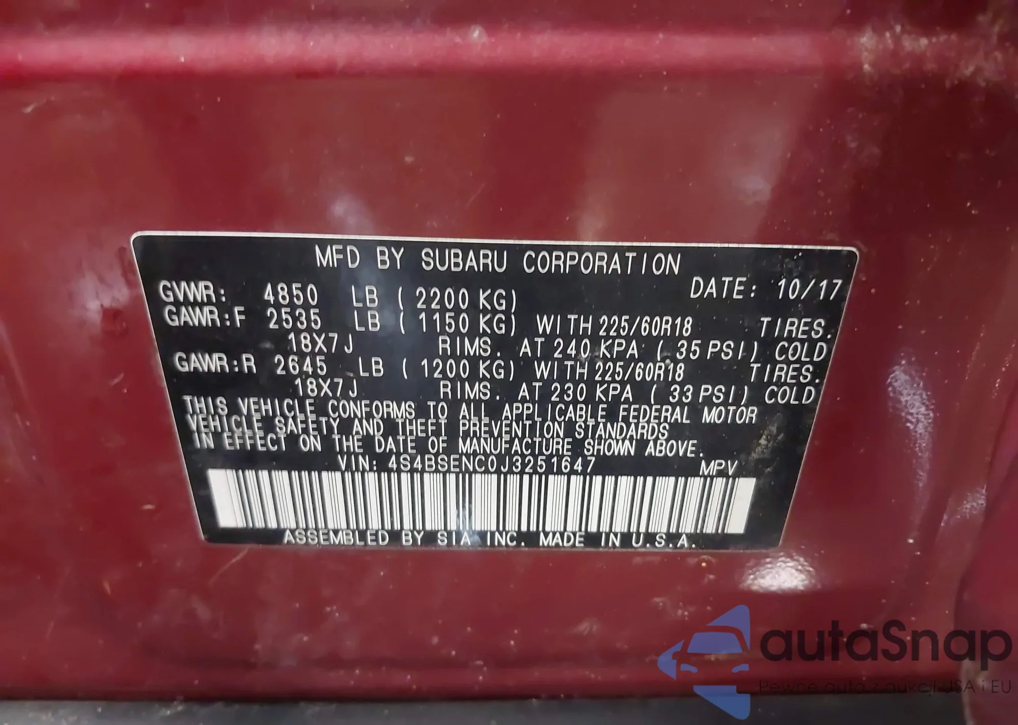 • VIN 4S4BSENC0J3251647