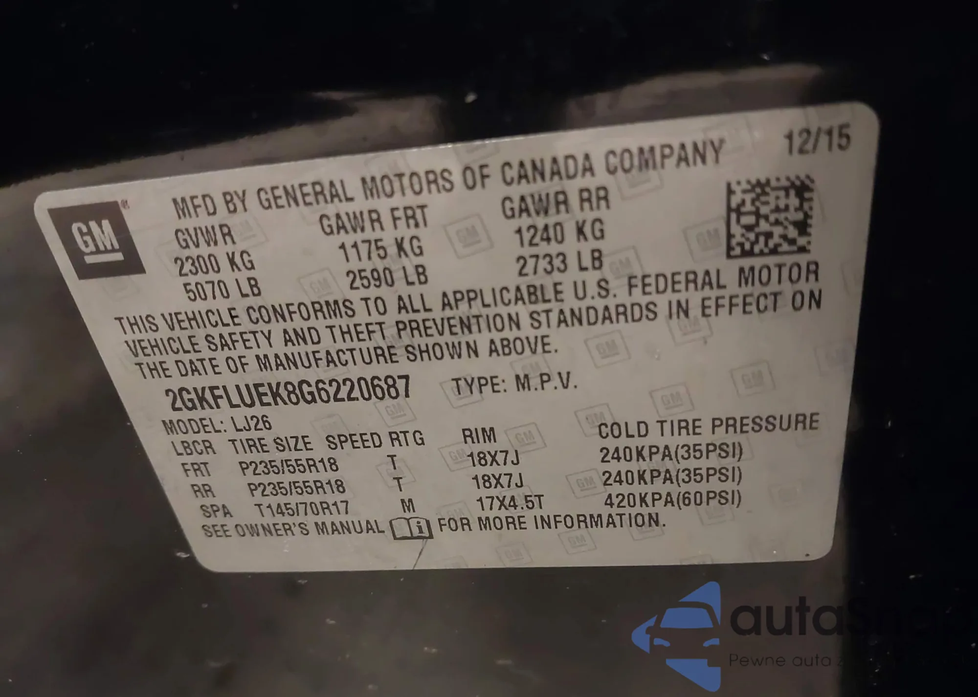 • VIN 2GKFLUEK8G6220687