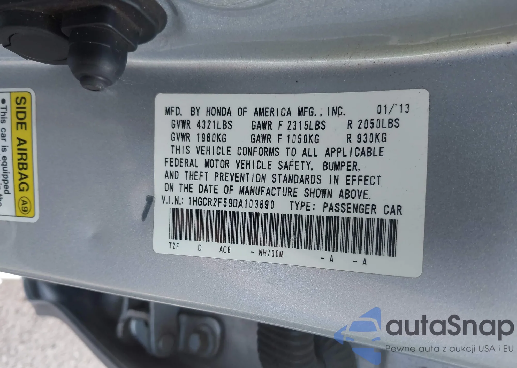 • VIN 1HGCR2F59DA103890
