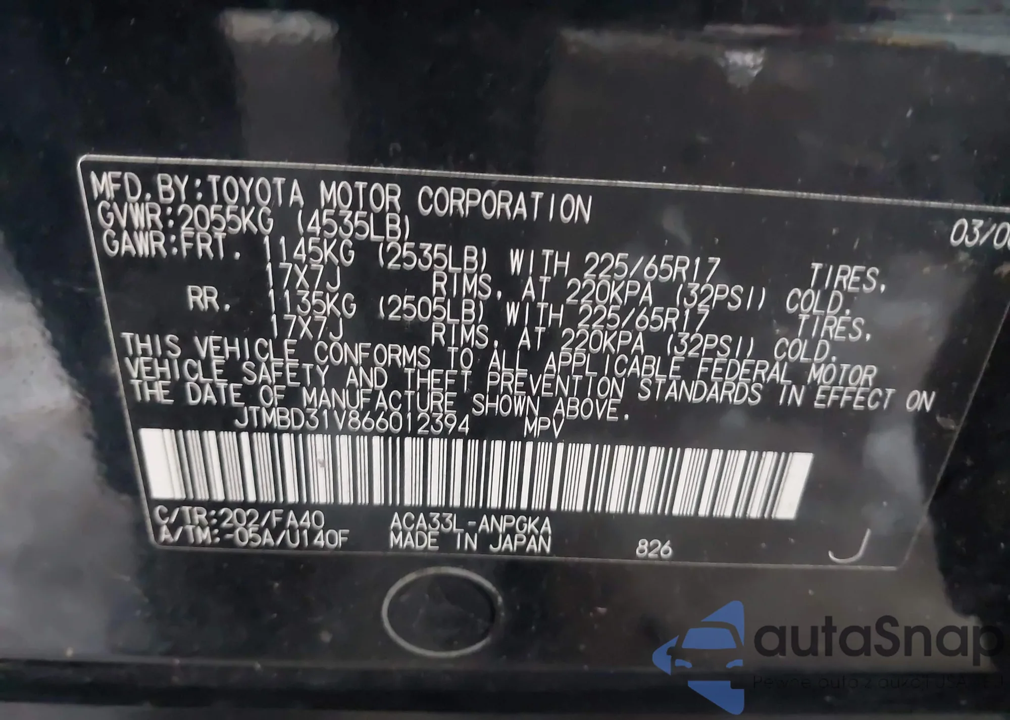 LOT: 43946853 VIN: JTMBD31V866012394